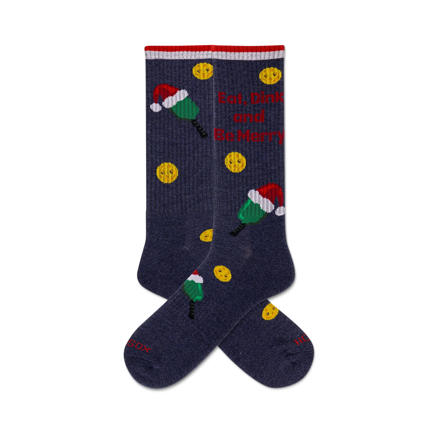 Pickleball is the sport where dinking reigns supreme, and what better way to celebrate this quirky pastime than with socks that say it all? Our Eat Dink Active crew socks combine fun and functionality. Featuring arch support and moisture-wicking technology, these socks ensure you stay cool and comfortable as you challenge your friends to a festive match. Made from recycled yarn, theyre a gift to both your feet and the planet. Plus, with cushioned soles, every step feels like a victory.