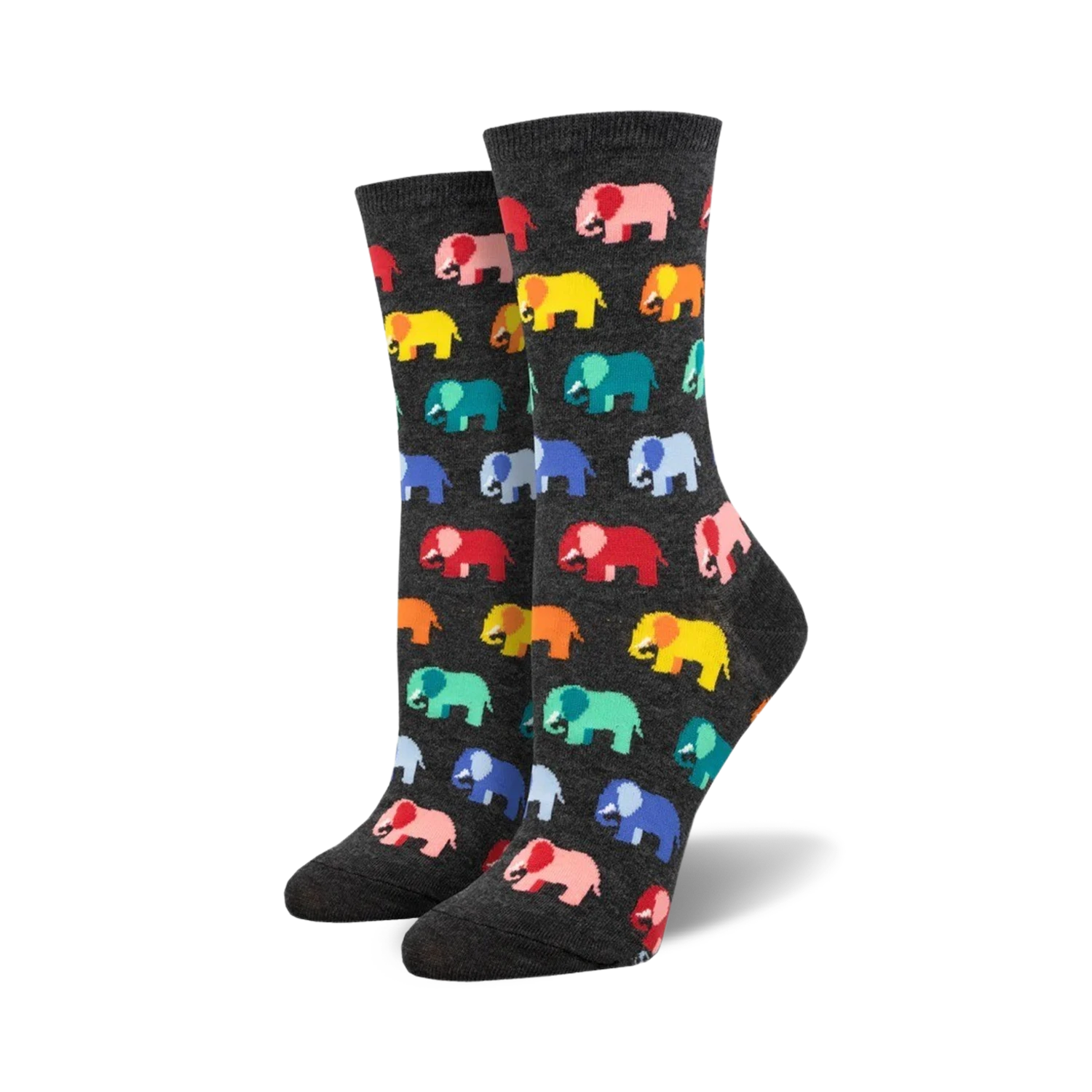 Elephants are like socks, they make everything better! These Elephant In The Room Crew Socks feature a repeating pattern of these majestic creatures in a rainbow of bold colors, stamped on a creamy background. So liven up your everyday look and your feet when you wear this fun women’s sock. They’re sure to become your favorites and brighten any gloomy day!