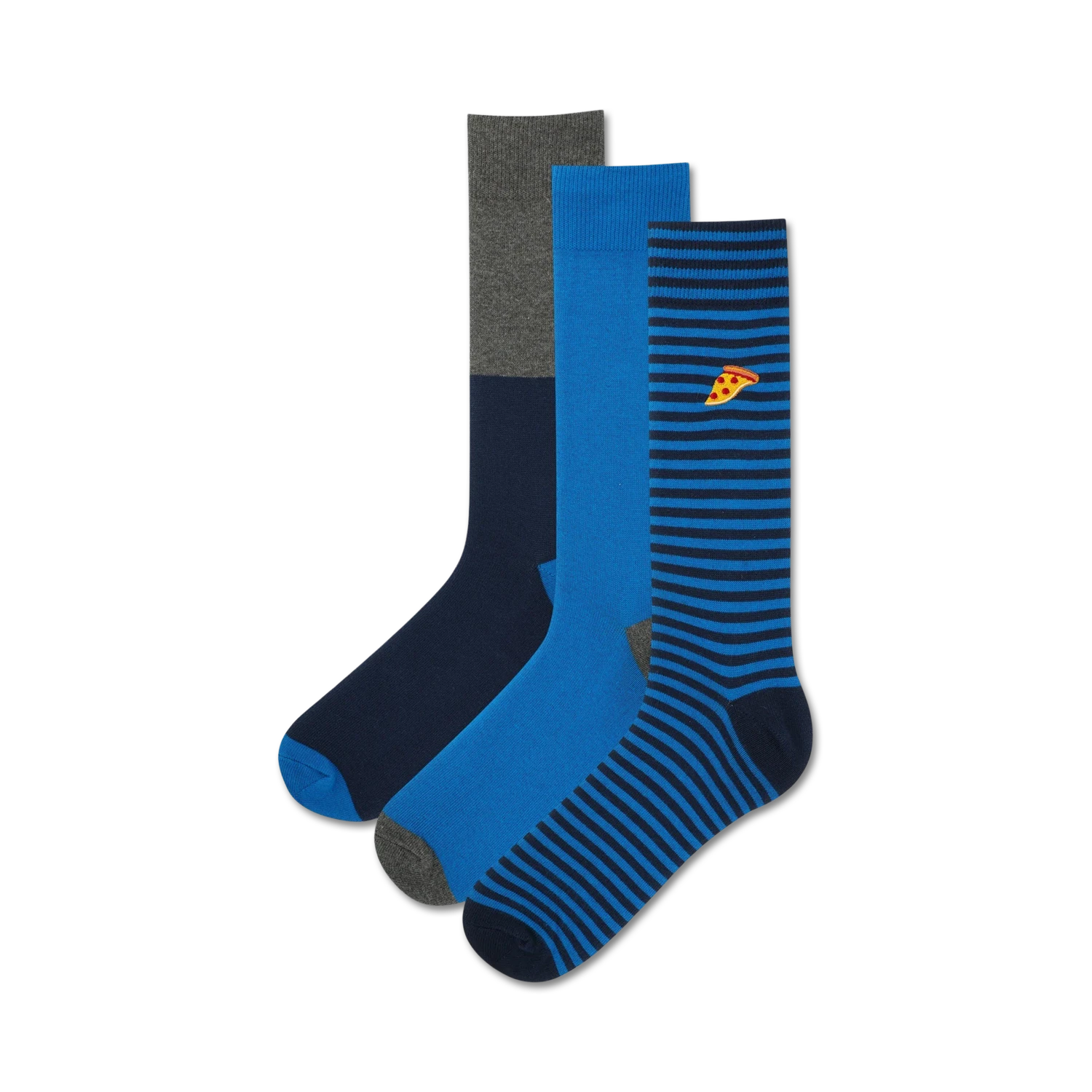 Crew socks for men in navy, blue, and gray with a pizza pattern. Who doesn’t love pizza, especially hanging out on a sock with stripes? These Embroidered Pizza Men’s 3 Pack are sure to please anyone who sees them. A reminder that life is too short to not have fun.