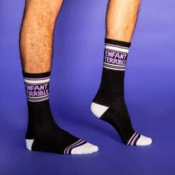 Laugh in the face of fashion norms with these Enfant Terrible socks, featuring the words “enfant” on the left sock and “terrible” on the right. These crew-length socks, perfect for both men and women, are bold, funny, and just a little bit rebellious. Wear them with your favorite sneakers or dress shoes and prepare for a barrage of compliments and curious glances. Whether you’re a rockstar, a nonconformist, or just someone who loves to have fun with their wardrobe, these socks are sure to become your new go-to’s.