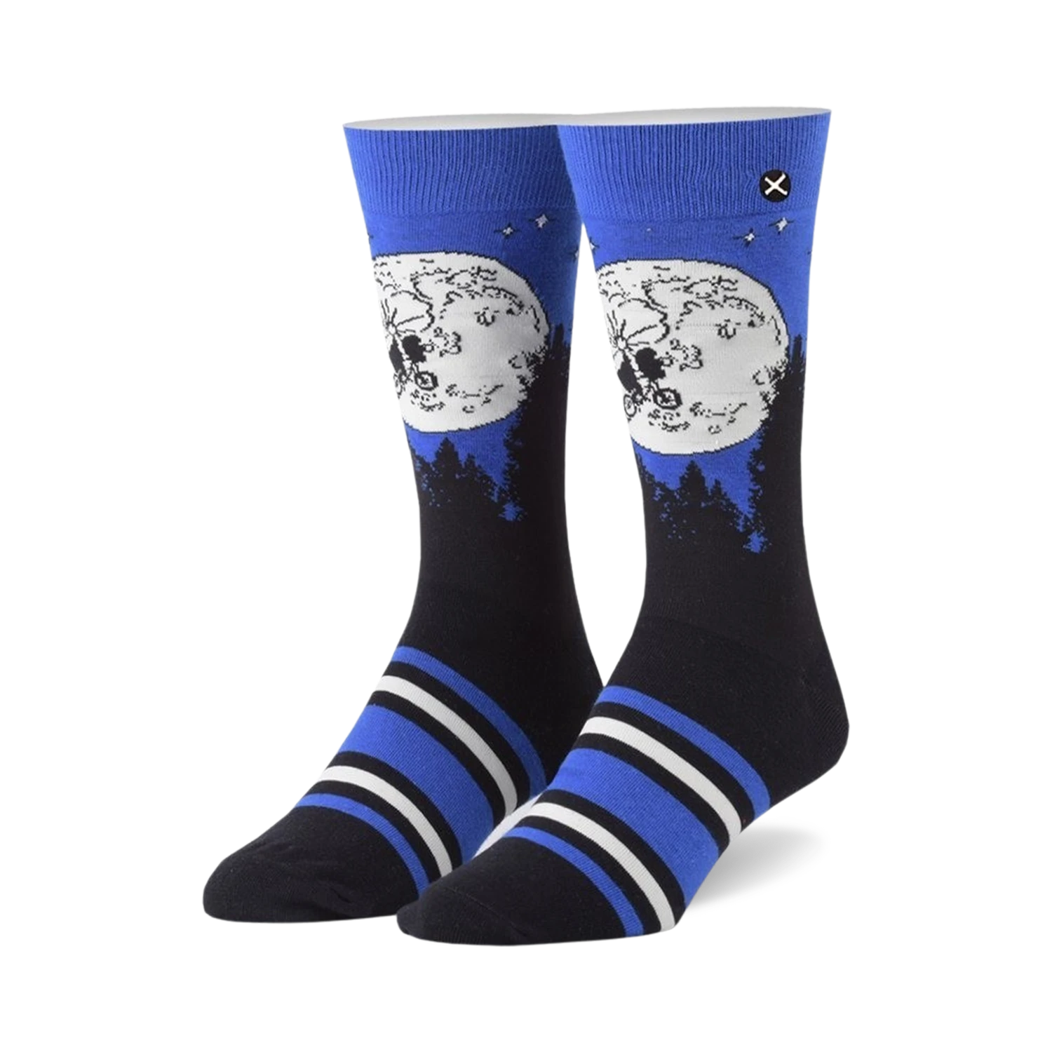 Pedal through the cosmos with these enchanting ET Escape socks! Blast off alongside the iconic E.T. as he cycles towards the moon, leaving his finger-shaped glow amidst a starry night sky. These socks are out of this world and perfect for any fan of the iconic movie. Available in both crew length for Men and Women.