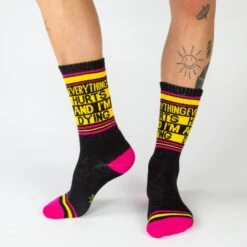 Do your socks make you laugh so hard your sides hurt? Maybe they make you howl like a banshee? Nope? Well then you must not own a pair of ‘Everything Hurts And I’m Dying’ socks yet! These jet black, pink and yellow socks feature the iconic meme text in bold hot pink and sunshine yellow. They don’t just make you the center of attention, these puppies scream personality so loud that you might just feel like you’re having an out of body experience because you’re seeing yourself crack jokes, do silly dances, and making new friends wherever you go. So what are you waiting for? Grab a pair and let the good times roll.
