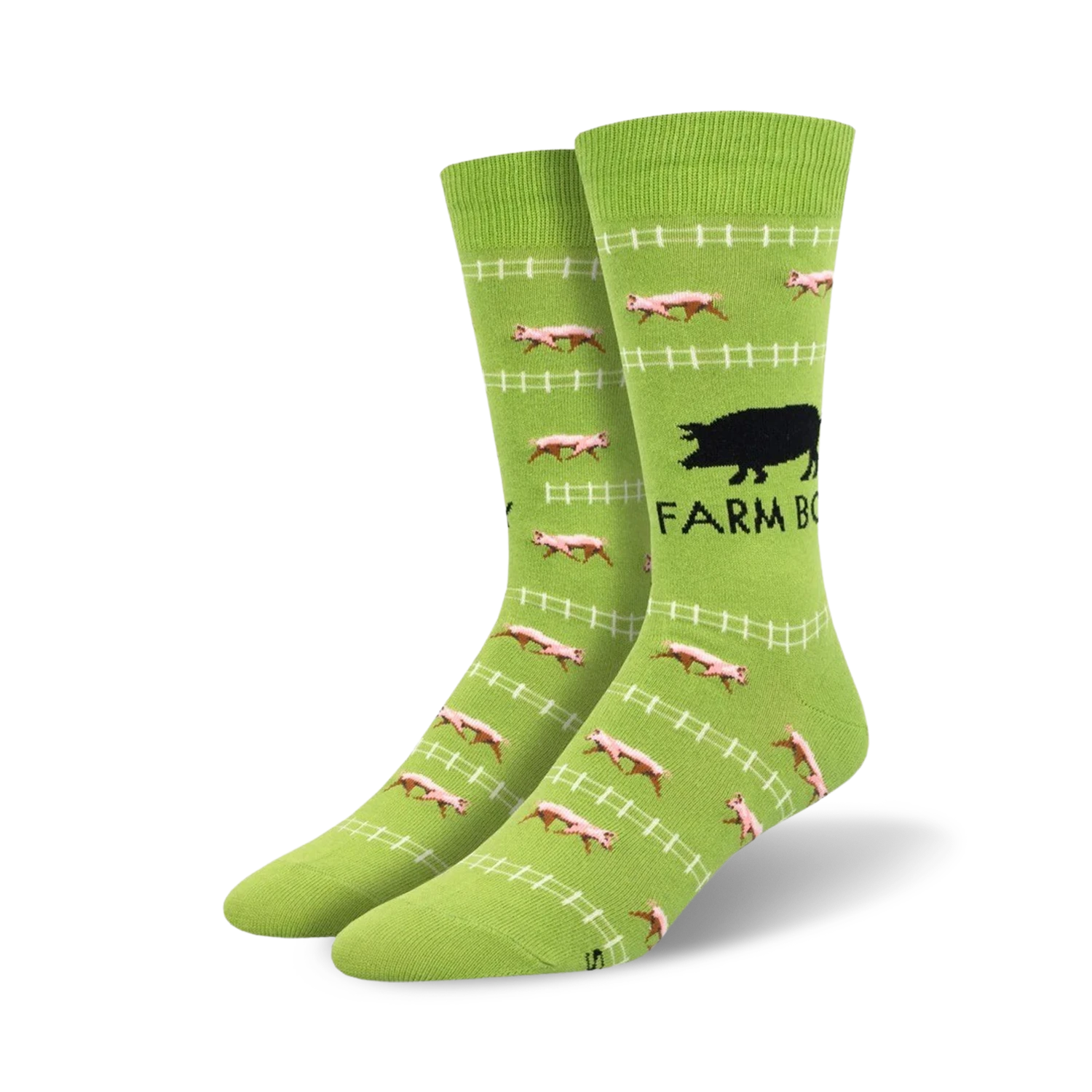 Get ready to root for the oink-tastic Farm Boy Crew Socks! These green socks sport a lively pattern of pink pigs in black collars, led by a distinguished pig sporting a sophisticated black hat. Whether you’re a farm-loving city slicker or a down-home country boy, these socks will have you squealing with delight. Show off your adoration for all things farm with these charming socks that are sure to bring a smile to your face and those around you. They also make a great gift for any pig enthusiast.