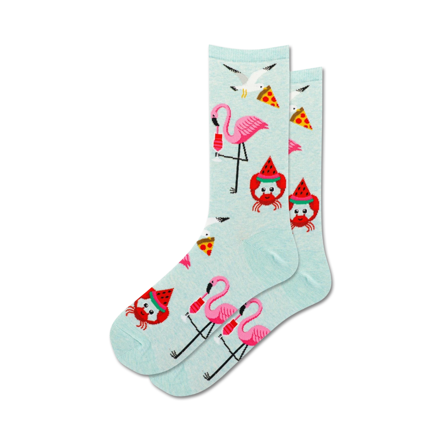 Flamingo, seagull, and crab crew socks for women, made in America, are the perfect way to add a touch of whimsy to your everyday look. With bright pink flamingos rocking watermelon slices on their heads, these socks will make you smile every time you put them on. Show off your love for pizza with the white seagulls wearing pizza slices on the heads. And don’t forget about the crabs, because everyone knows they love watermelon slices! Perfect for a day at the beach or a night out on the town, Flamingo, Seagull, and Crab socks are sure to turn heads wherever you go.