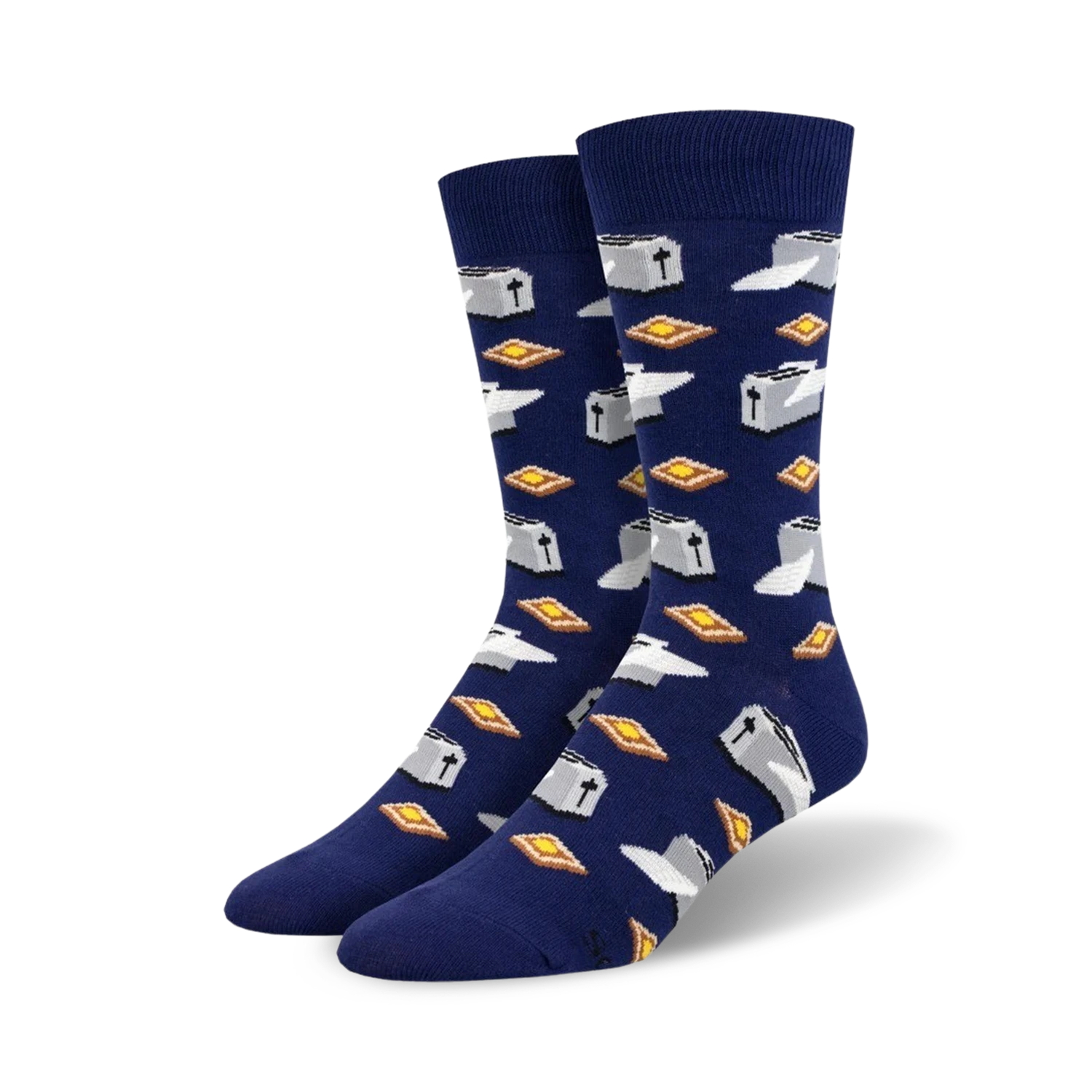 Prepare to be toasted by our “Flying Toaster” socks! Featuring a vibrant blue backdrop sprinkled with slices of buttered toast and soaring toasters, these socks will have you “wheeling” with laughter. Perfect for the breakfast enthusiast or anyone who appreciates a touch of whimsy, these crew-length socks for men are sure to be a “toast” of the town. Get ready to “flip” for our “Flying Toaster” socks today!