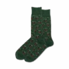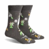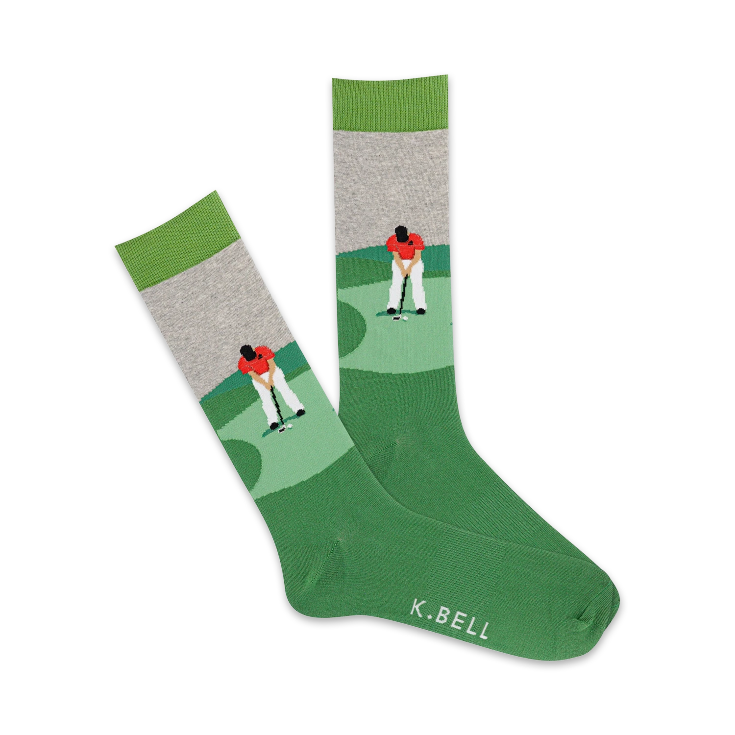 Meet Focused Golfer! Hit the green in our dark green crew socks with gray cuffs and light green toes. This novelty sock features a golfer in a red shirt and khaki pants, surrounded by lush green grass. These socks are the perfect way to add some fun and personality to your golf game. Fun fact: Golf balls have 336 dimples. Who knew?!