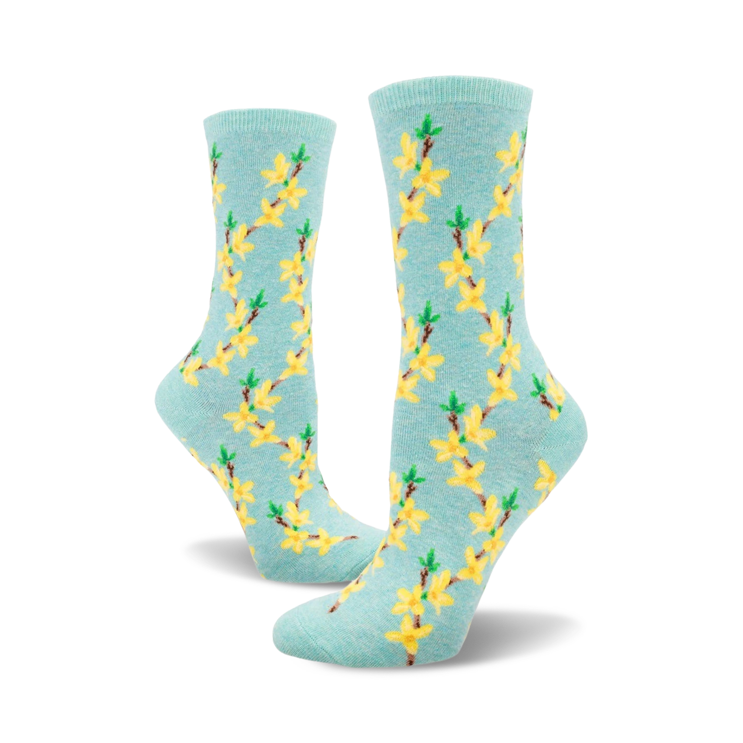 Forsythia socks: A spring in every step. The pale blue background is reminiscent of the cloudless sky and the forsythia flowers, with their sunny yellow petals and verdant leaves, brighten up any day. They’re perfect for gardening, walking, or a day out in the park. Plus, they’ll make you smile every time you look down at your feet.