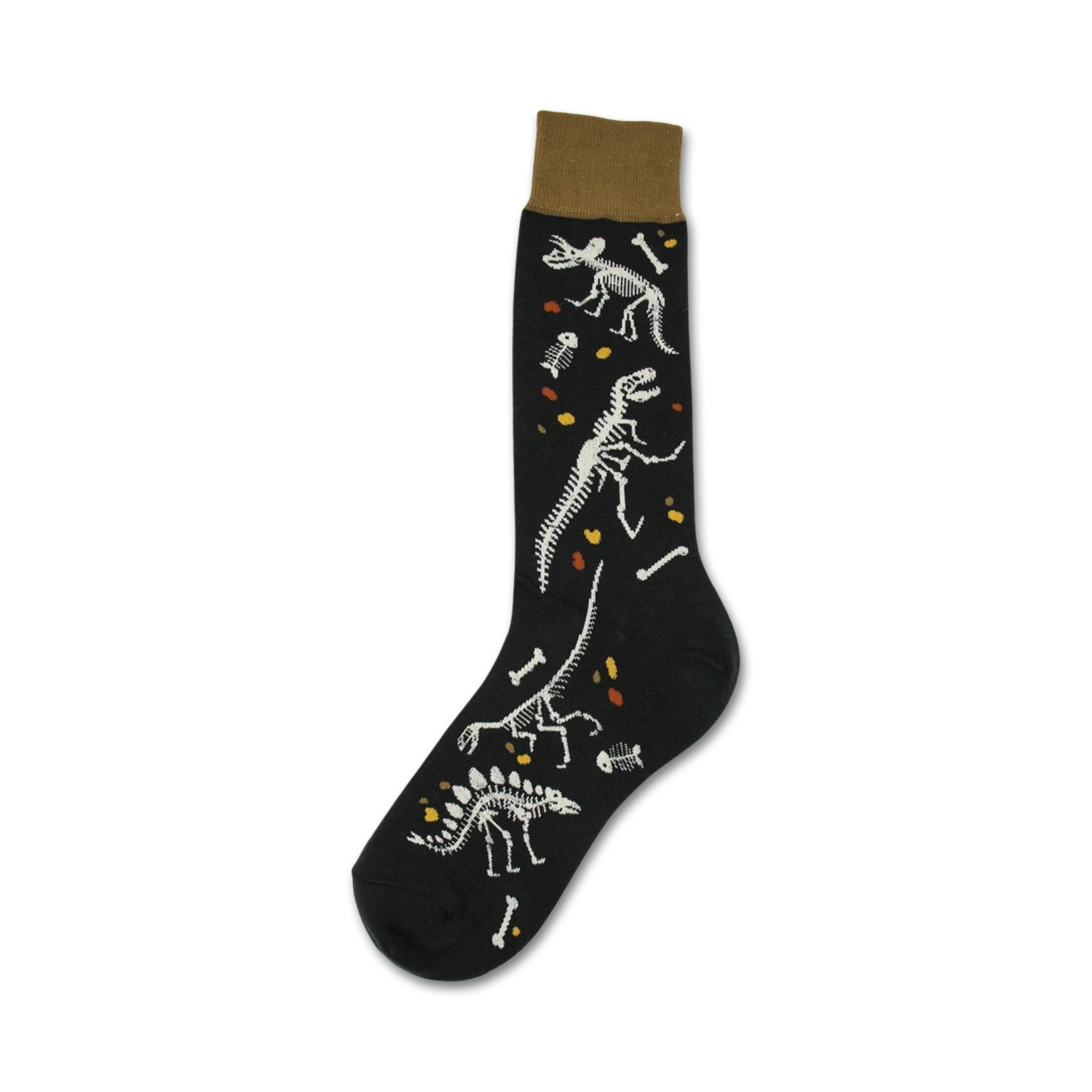 The past is back, and on your feet! Rock these Fossils crew socks for men featuring a T-rex and triceratops pattern. Prepare for a prehistoric moment every time you look down at your feet! Like any good fossil, these socks are built to last and sure to make you stand out.