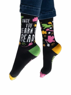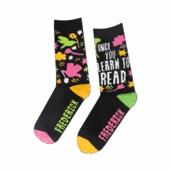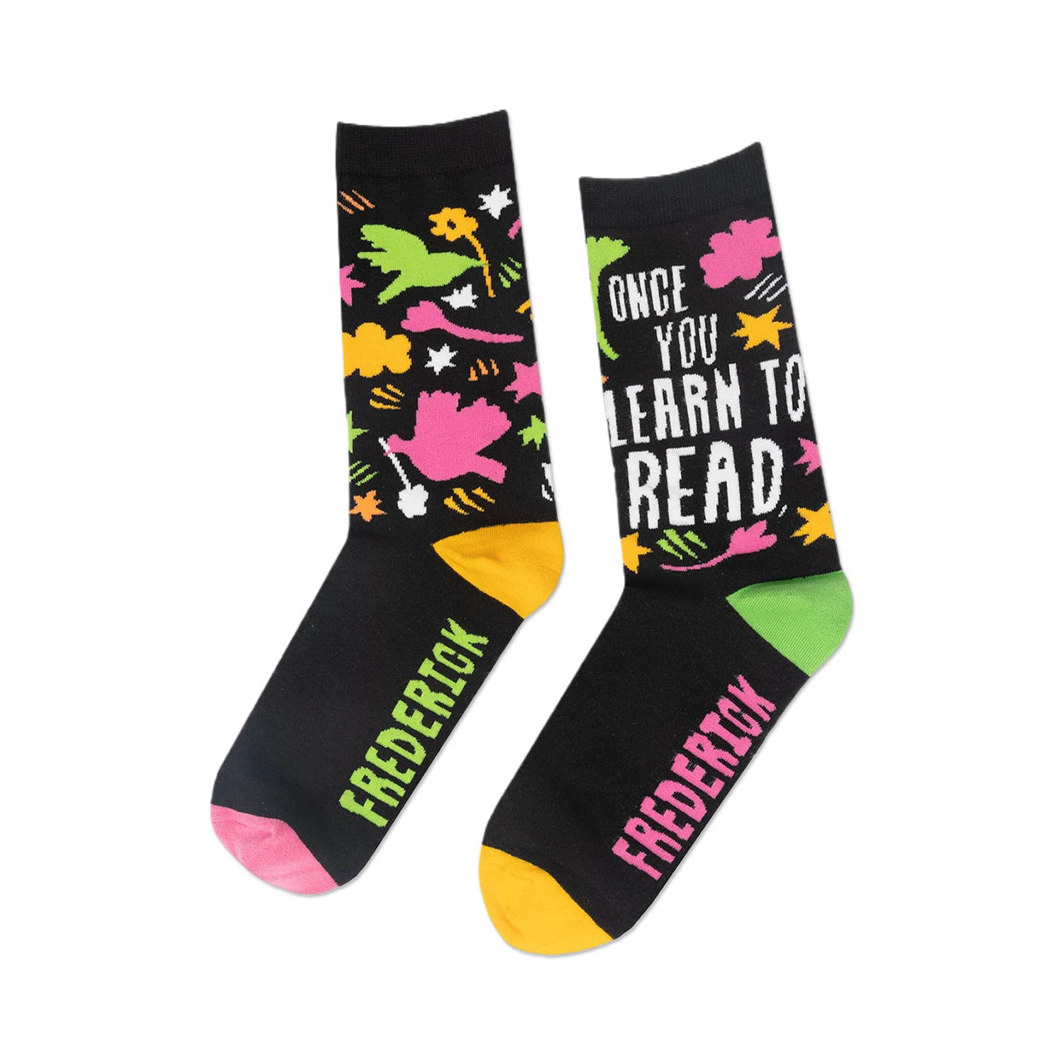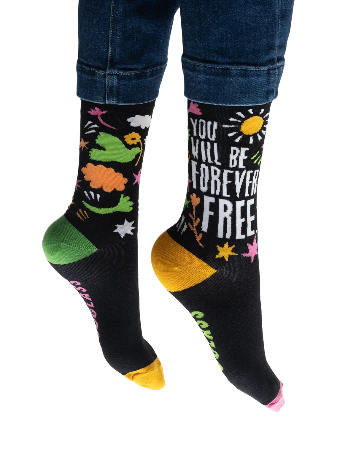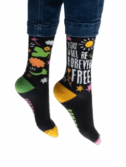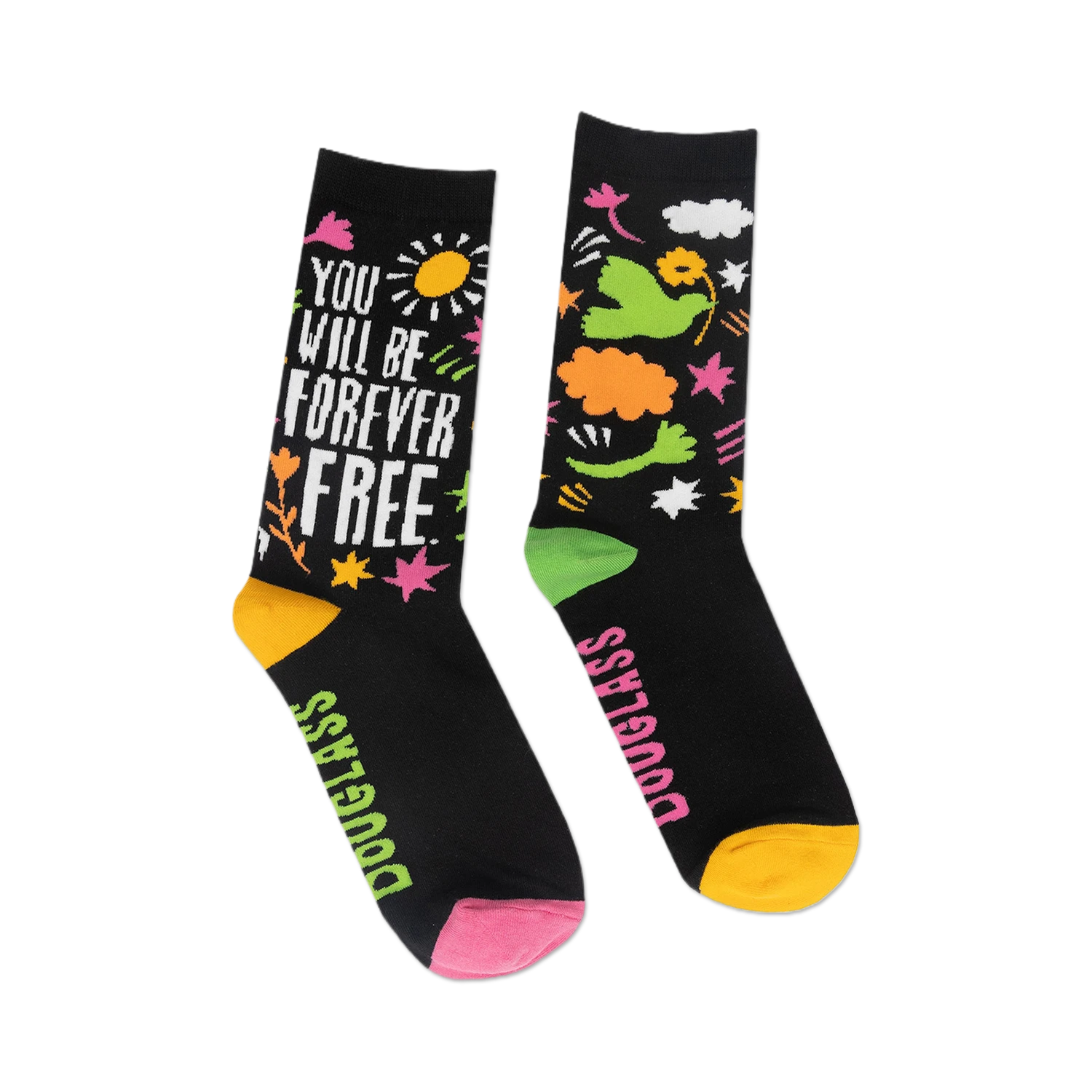 Celebrating the power of words, these Frederick Douglass socks remind us that literacy is the key to freedom. With vibrant designs featuring uplifting quotes, these socks are a joyful tribute to the transformative magic of reading. One sock proudly proclaims “You will be forever free,” while the other blooms with flowers and a bird, making every step a statement.