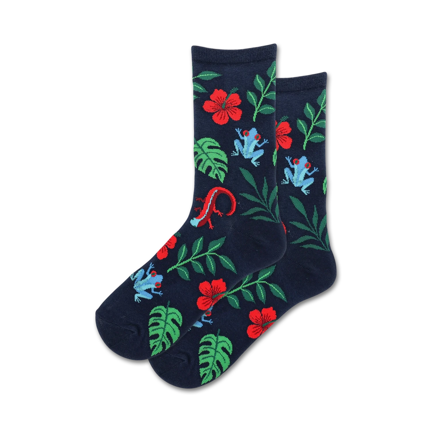 Tropical patterns, bright colors, a mix of frogs and lizards, and the length of crew socks combine together to bring you Frog Lizard Leaf crew socks, made just for women. With a design that kicks back and grooves to the rhythm of good times, these dark blue socks with shades of green and pops of red will quickly become a fave in your sock drawer.