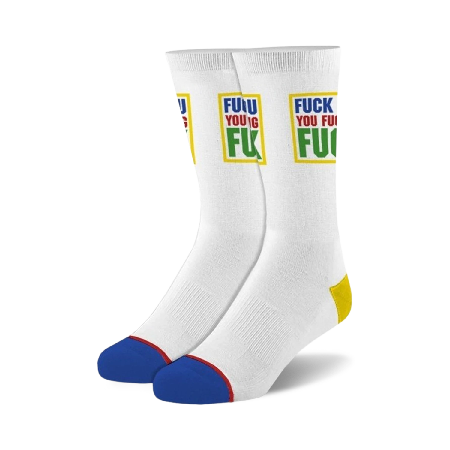 Step into these socks and declare your sentiments loudly. It’s bolder than a bullhorn, more vivid than a siren, and less likely to get the cops called on you. The blue toes and heels add some pop, and the yellow heel tab makes it easy to put them on and take them off. Whether you’re at work, at home, or in the wild, flaunt these socks and be the life of the *F-ing* party. Show everyone that you’re not one to suffer scallywags and scoundrels gladly.