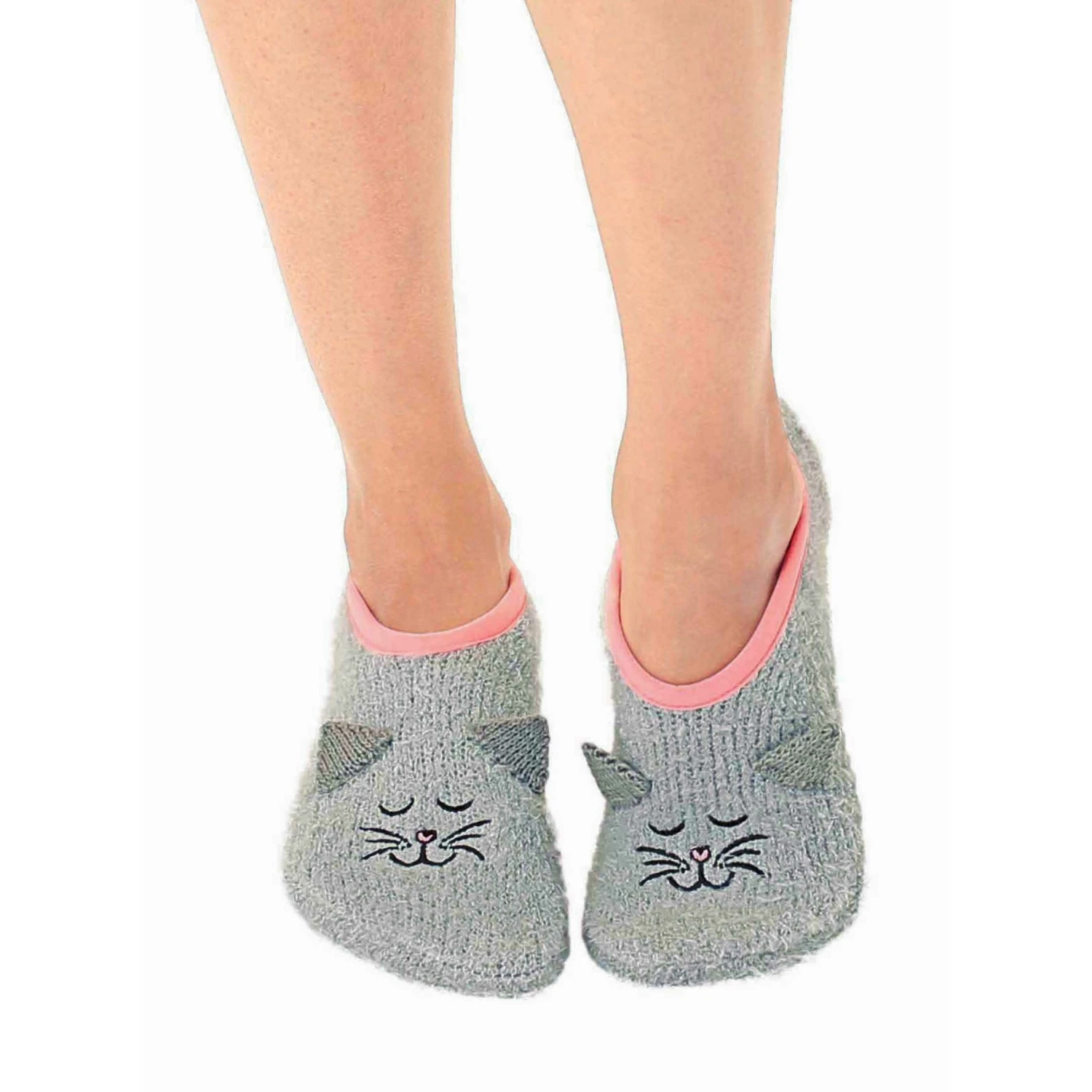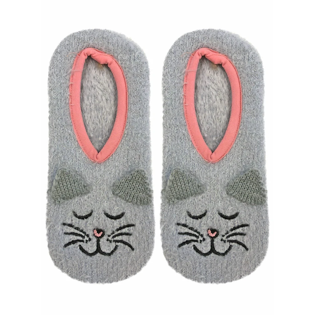 These cozy fuzzy cat slipper socks in gray and pink with non-skid soles, closed eyes, pink nose, and black whiskers are the purrfect way to keep your feet warm and comfy while you lounge around the house. They’re also great for a fun and unique gift. Like cats? Slip into a pair of these adorable slipper socks and leave your worries away!