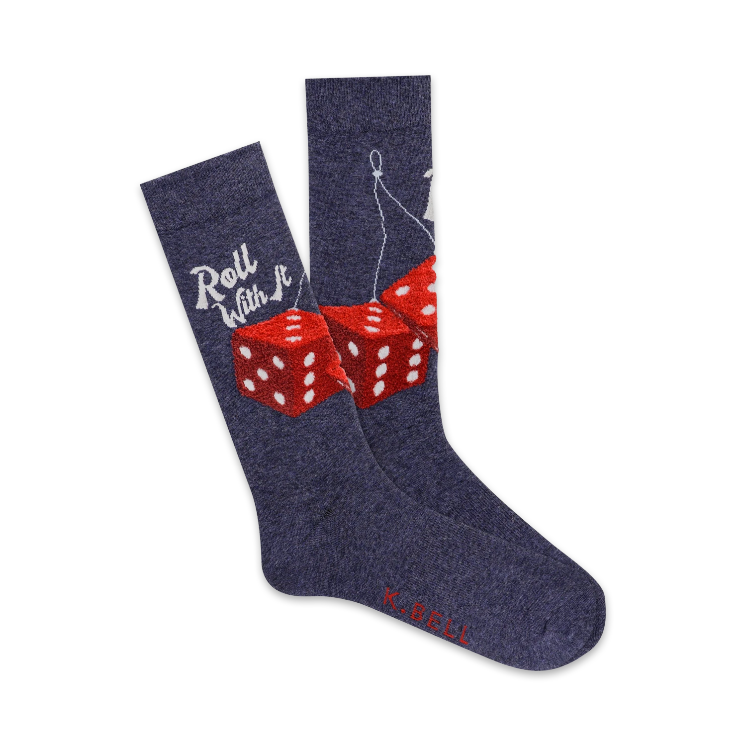Fuzzy Dice: Roll With It Socks That Are a Gamble-ing Good Time! Take a chance on looking sharp with these Fuzzy Dice socks, the perfect choice for those who love to gamble and look stylish. Featuring a vibrant blue backdrop with red fuzzy dice and a playful “Roll With It” message, these socks will turn heads at any casino, card game, or poker night. Made for men, they’re sure to bring you luck and compliments wherever you wear them. Put on a pair and feel the thrill of the game!