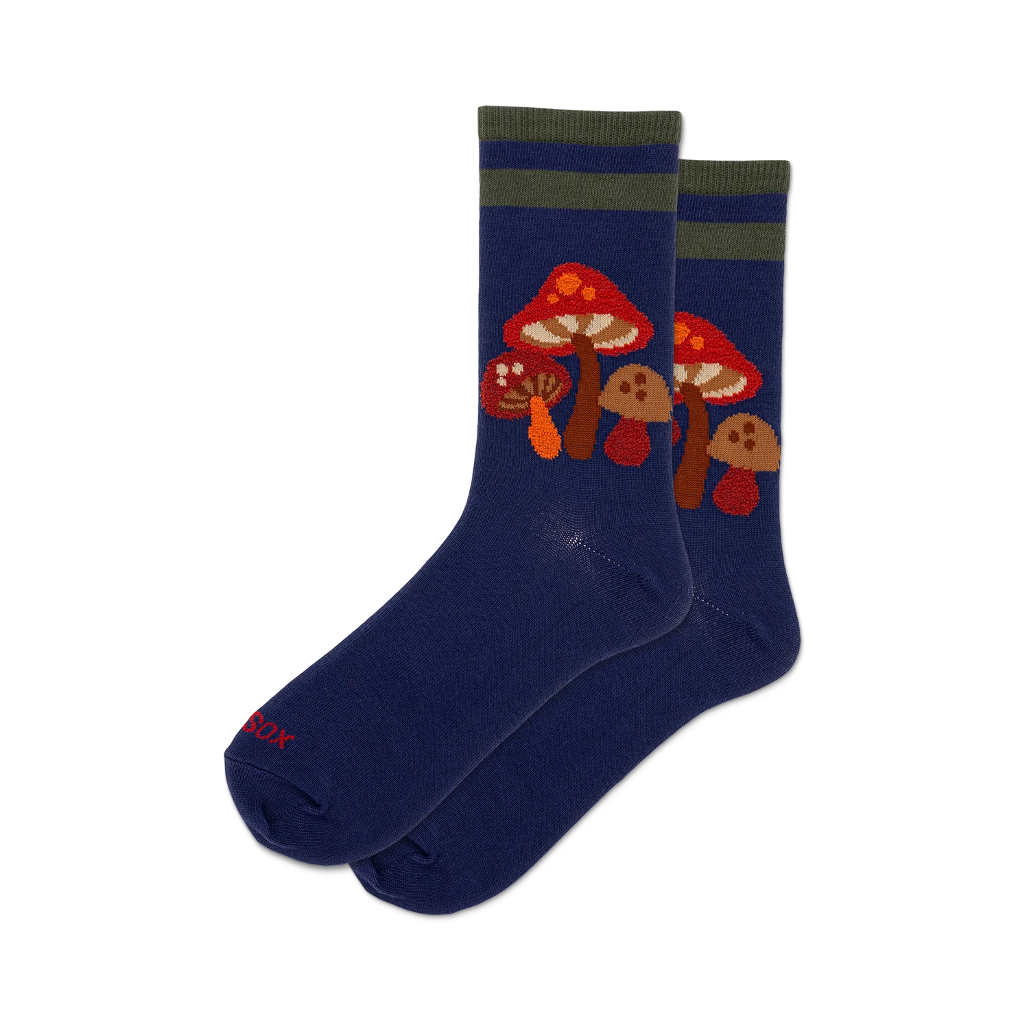 In a world where fungi are the unsung heroes of the forest, our Fuzzy Mushroom Crew Socks pay tribute with a playful twist. These socks transform a simple walk in the woods into a whimsical journey, thanks to their enchanting 3D mushroom design crafted from fuzzy yarns. With a rich navy backdrop and charming green stripes, they capture the essence of autumn, making them an ideal companion for your cozy fall adventures.