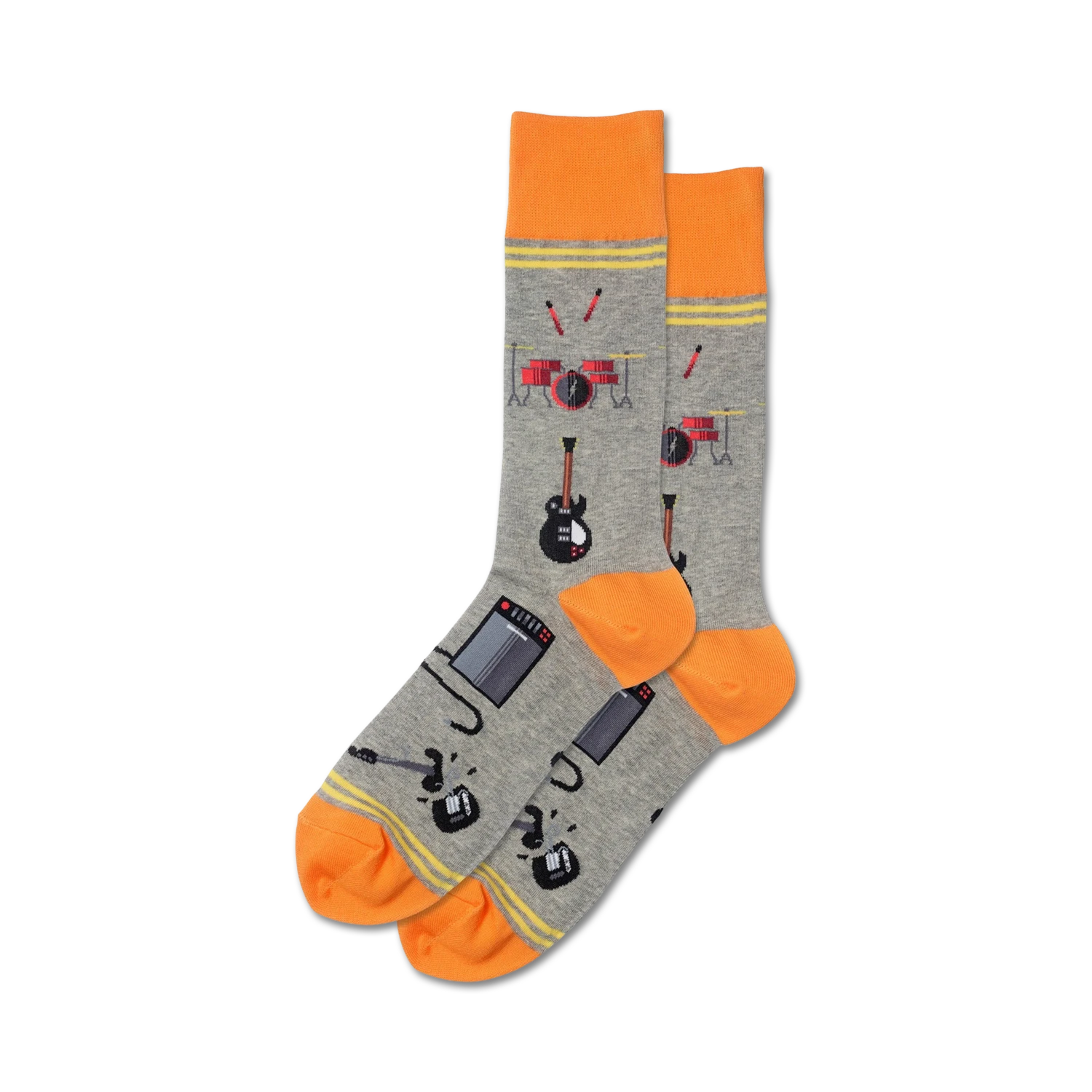 These Garage Band socks rock out loud! With their orange toes, heels, and stripes, and rad pattern of gray amps, black guitars, red drums, and orange keyboards, these mens crew socks will make you the star of any show. They’re the perfect way to show off your musical spirit and let your feet do the talking! If you want to be in the band or in the stands, Garage Band has you covered.