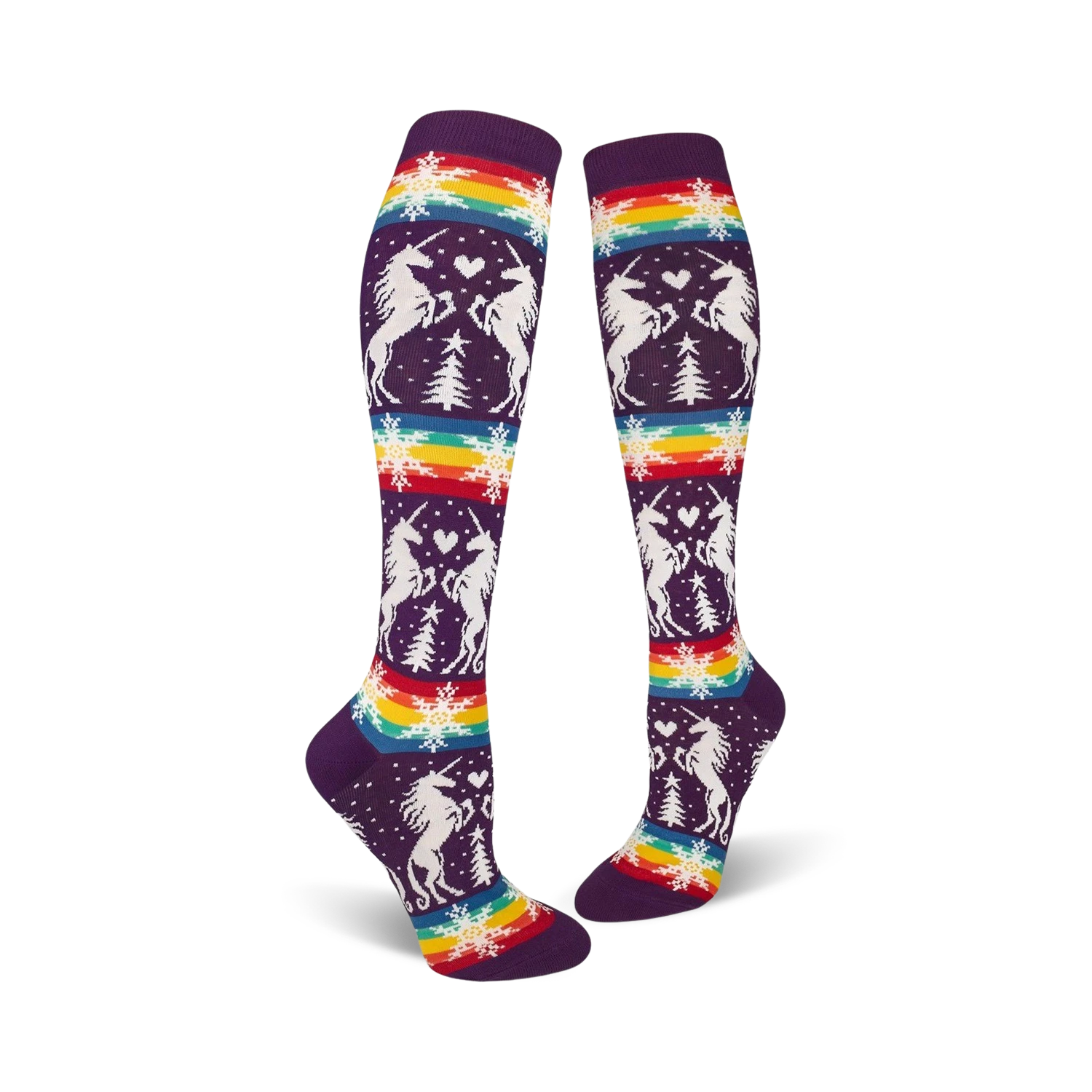 Unicorn knee-high socks for womxn are a colorful celebration of all things magical. With a kaleidoscope of unicorns, hearts, snowflakes, and rainbows, these socks are perfect for adding a touch of whimsy to any outfit.