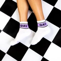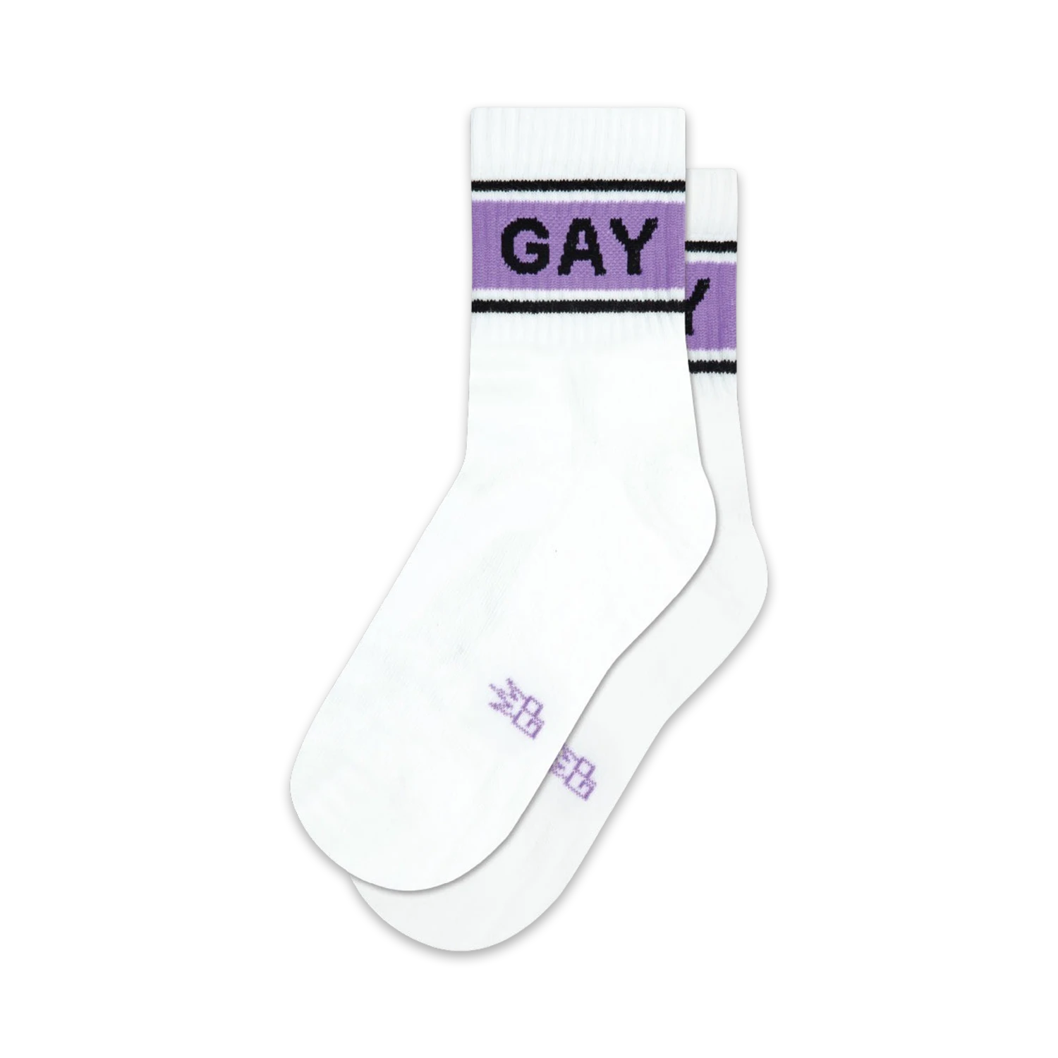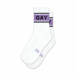 Pride month? Nah, they’re Gay every month. Reach your peak pride in these quarter length socks featuring bold white with purple stripes and the word “GAY” in purple block letters across the top. Perfect for men and women who are down for a good laugh at the average sock.