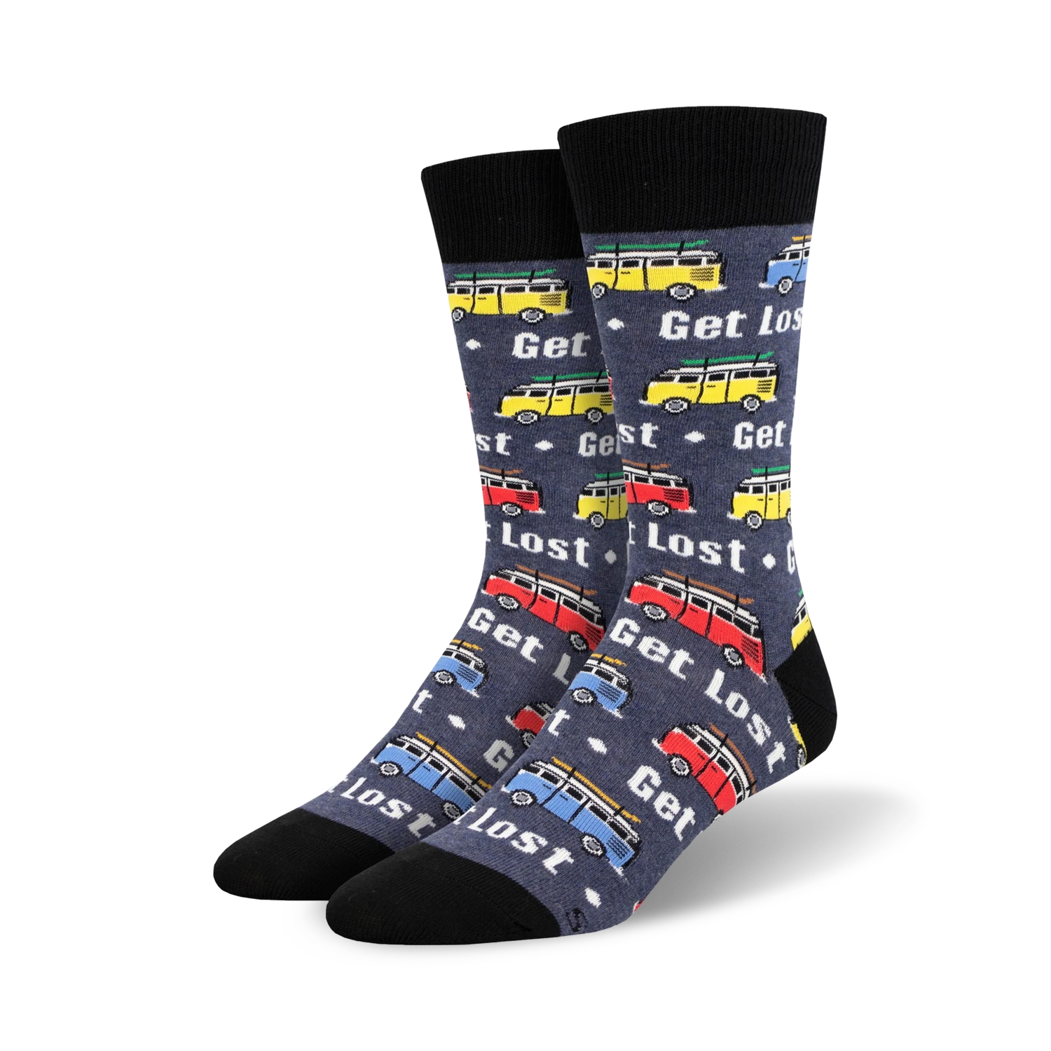 Get Lost: Crew socks with a rad pattern of multicolored camper vans and the words ‘get lost’ taking you on a groovy adventure with every step. Whether you’re hitting the road or just dreaming of the open highway, these socks will have you feeling far out, brother.