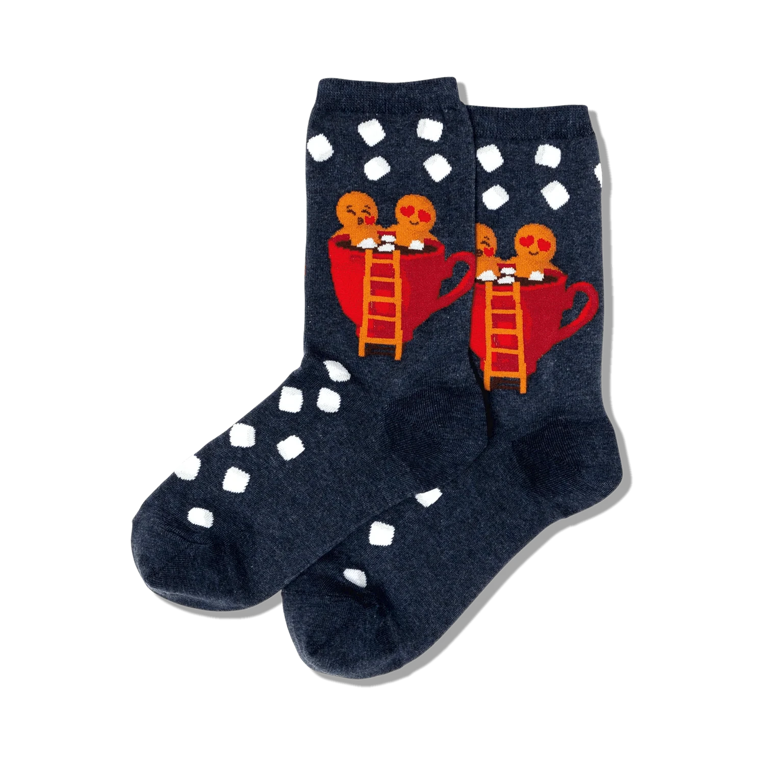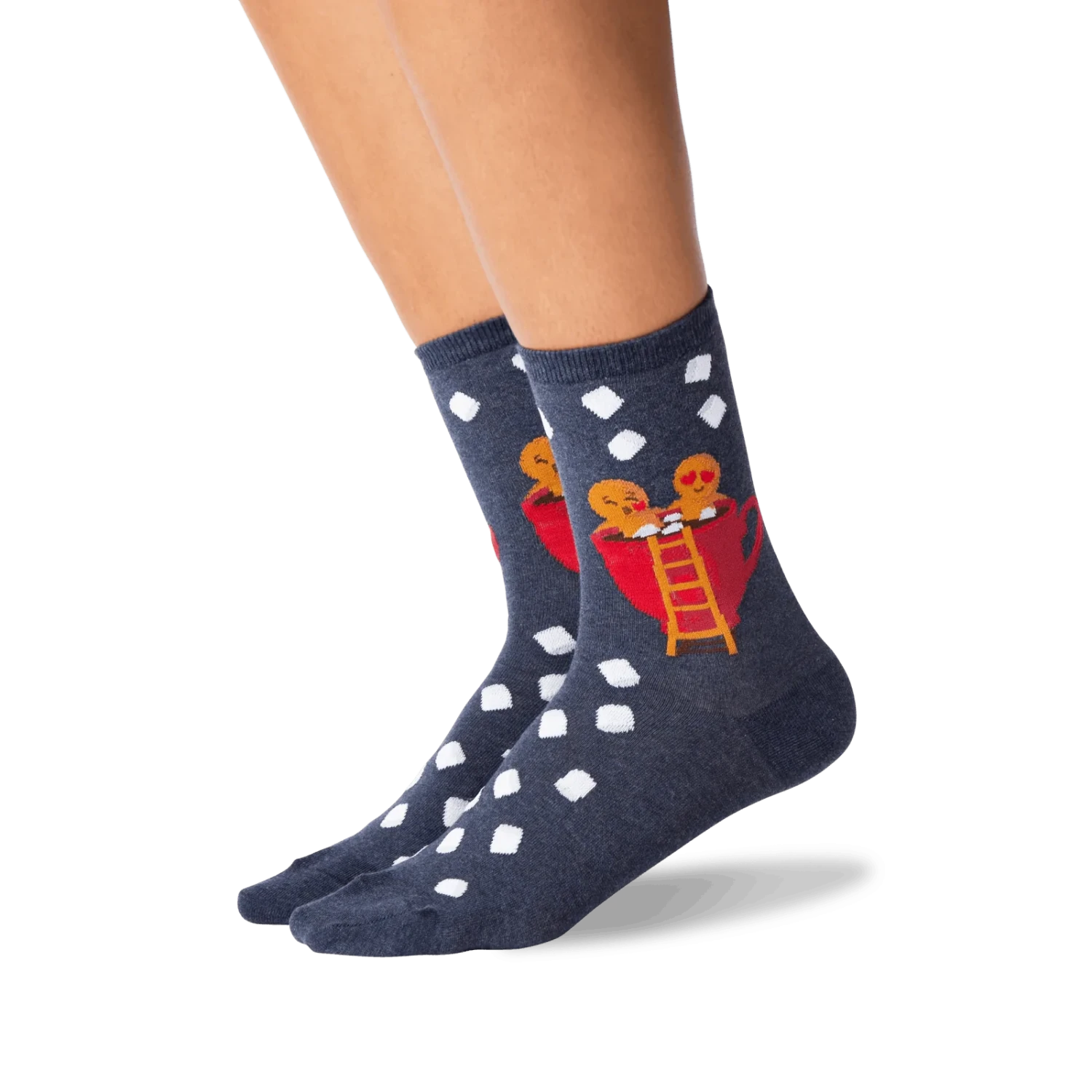 Meet the Gingerbread Couple Crew Socks: A sweet, festive pair that’s perfect for the holiday season. These dark blue socks with white polka dots feature a gingerbread man and woman standing in a red coffee cup with a ladder beside them. They’ll be a fun and unique gift, even if you give them to yourself!