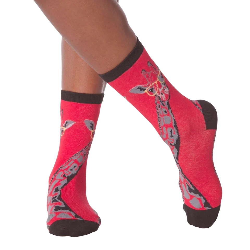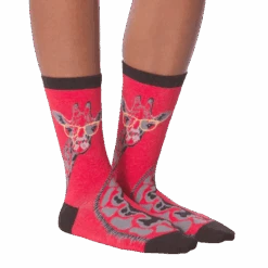 Giraffe with Glasses socks are the height of fashion, with a stylish pattern of giraffes sporting some shades. Featuring a bright red background, these cotton blend socks feature gray and black giraffes with black glasses. The black toe and heel add a touch of sophistication, while the gray cuff keeps your ankles cozy. Let these socks put a smile on your face and let the world know you’re not afraid to stand out! Who knew giraffes could be so fly?