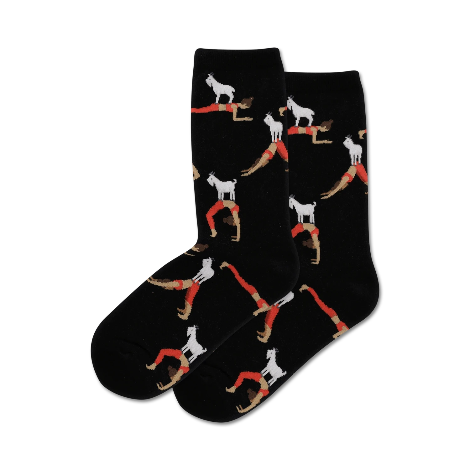 Stand tall in your style with these Goat Yoga socks! These crew-length, black socks feature a quirky pattern of orange goats striking various yoga poses. Channel the inner peace of these flexible goats and keep your feet cozy in these fun and unique socks you’ve goat to try them!