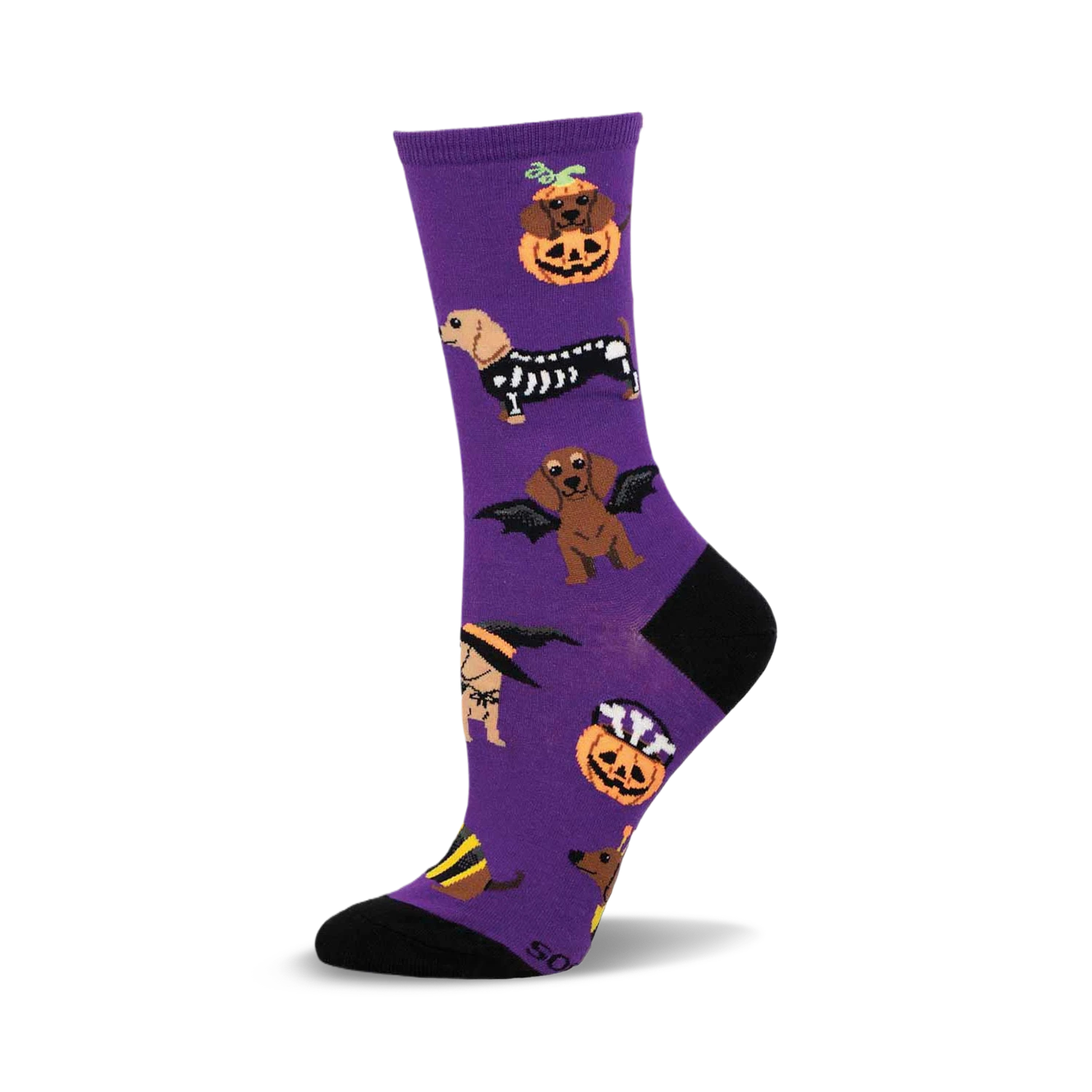 There’s something universally delightful about a dachshund in a Halloween costume. Whether it’s a witch, a skeleton, a vampire, or a pumpkin, these playful pups bring a smile to anyone’s face. Now, imagine capturing that joy on a pair of cozy purple crew socks. Perfect for adding a touch of whimsy to your wardrobe, these socks are a spirited way to celebrate the season with a dash of canine charm.
