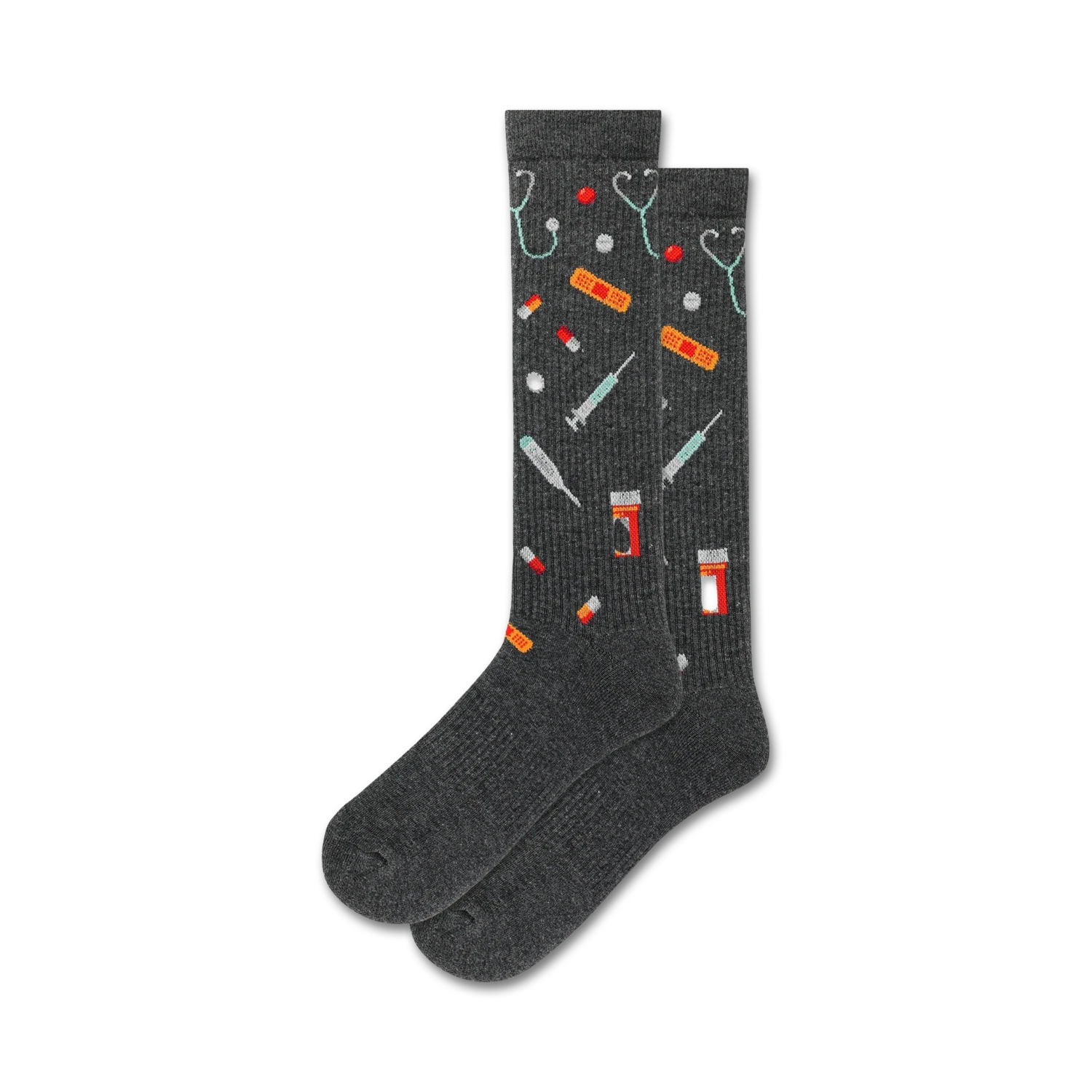 Healthcare Worker Socks: Step into a World of Medical Humor! Who said medical work can’t be fun? These Healthcare Worker socks are bursting with an infectious energy that’s as contagious as a good laugh! An array of stethoscopes, pills, bandages, and syringes dance across these socks in colors that’ll brighten your day, proving that even work socks can be a cure for boredom! So, whether you’re a nurse, doctor, hospital hero, or just a fan of healthy humor, these socks will give your feet the attention they deserve!