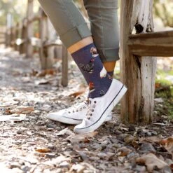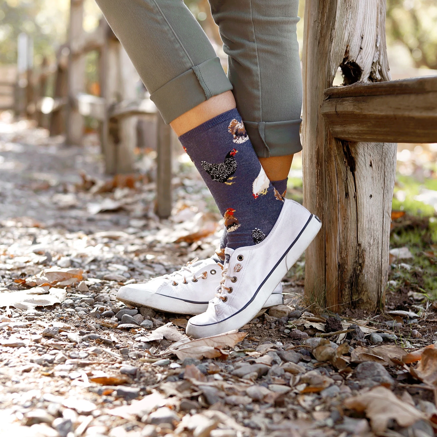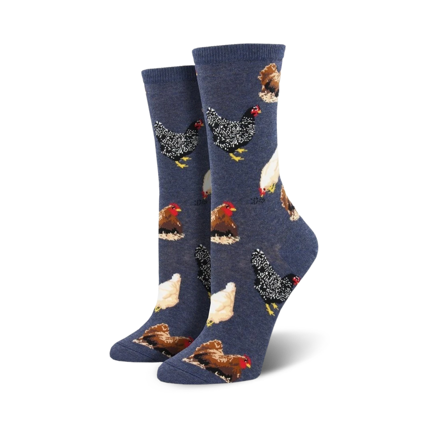 Buckle up, folks, and get ready for some clucking-good fun with our Hen House novelty socks! These women’s crew socks are decked out in a delightful pattern of various chicken breeds, from the stately Rhode Island Red to the sassy Leghorn. Show off your love for these feathered friends and add a touch of whimsy to your everyday look. Fun fact: Did you know that chickens can dream? Well, now you do! So slip on a pair of these socks and let your imagination soar, just like a chicken dreaming of flying.