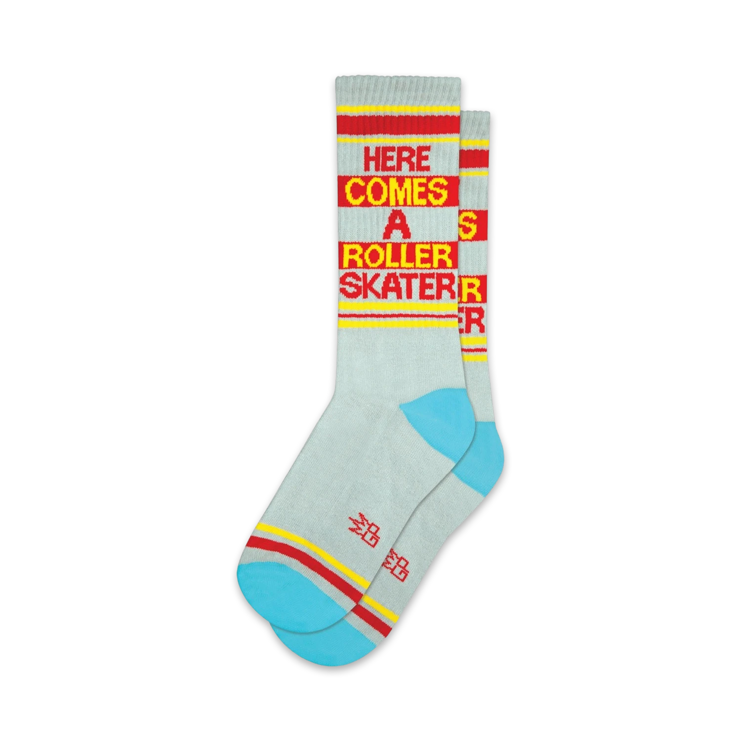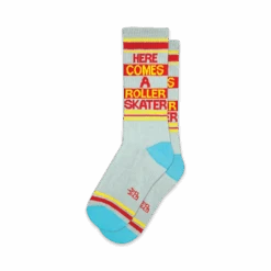 Get ready to roll into style with our Here Comes A Roller Skater Gym socks! These light gray crew beauties will have you gliding through the day with their blue toes and heels that’ll make you feel like you’re living on cloud 9. Plus, the bold red and yellow lettering on the front spells out “Here Comes A Roller Skater,” so everyone can catch your moves. So, grab a pair and lace up your skates, because fashion and fun are about to take a wild ride!