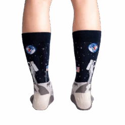 Blast off to the moon in these High-est 5 socks for men! These crew socks are black with a gray toe and heel, and they feature an image of two astronauts on the moon on each sock, wearing American flag patches on their suits. There are also images of the Earth and the American flag on the socks.