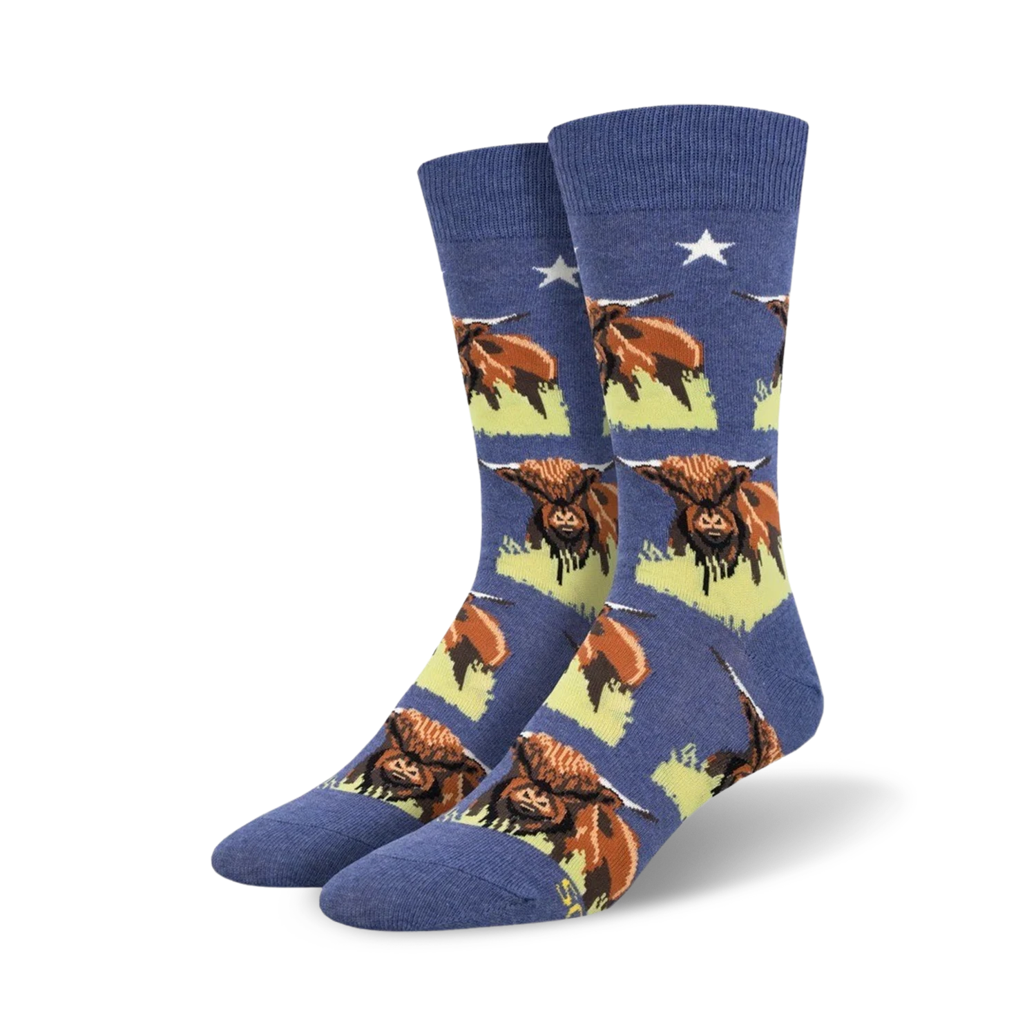 These blue crew socks are adorned with a delightful pattern of brown highland cows with long horns, standing on a backdrop of green grass and white stars. They’re an adorable way to add a touch of whimsy and fun to your everyday wardrobe. Perfect for cow lovers and anyone who enjoys a bit of novelty in their socks!