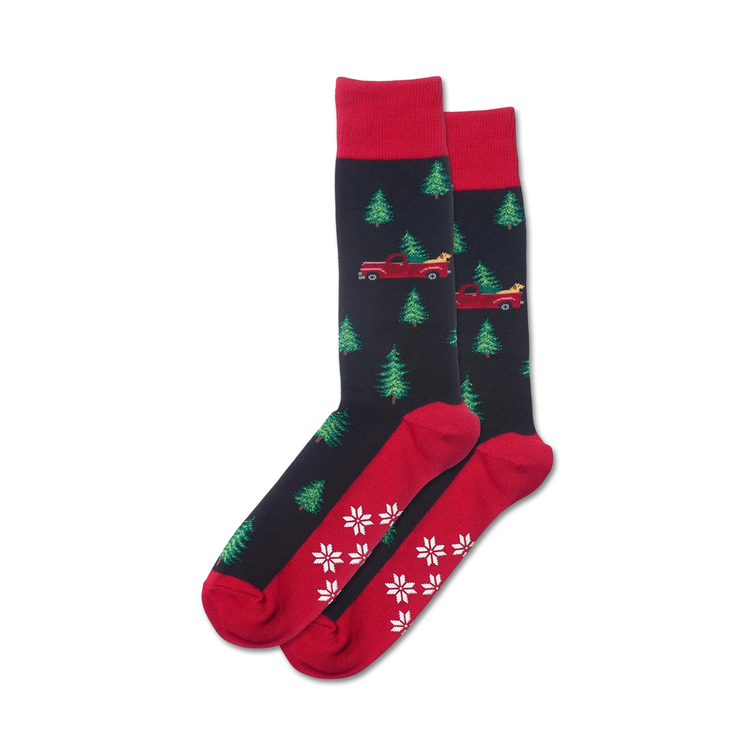 Deck the halls and spread some holiday cheer with our “Holiday Trucks Non-Skid Slipper” Men’s Crew Socks! Picture this: dashing red pickup trucks hauling fresh green Christmas trees, all adorned with cute white snowflakes, cruising across the black sock canvas. Who knew Christmas could be so smooth? The red cuffs and toes add a festive touch, while the non-skid grippers on the red soles keep you from slipping and sliding like Santa on a slippery roof. These socks are perfect for spreading holiday joy and warmth, one merry step at a time. Grab a pair and let the Christmas spirit truck you over!