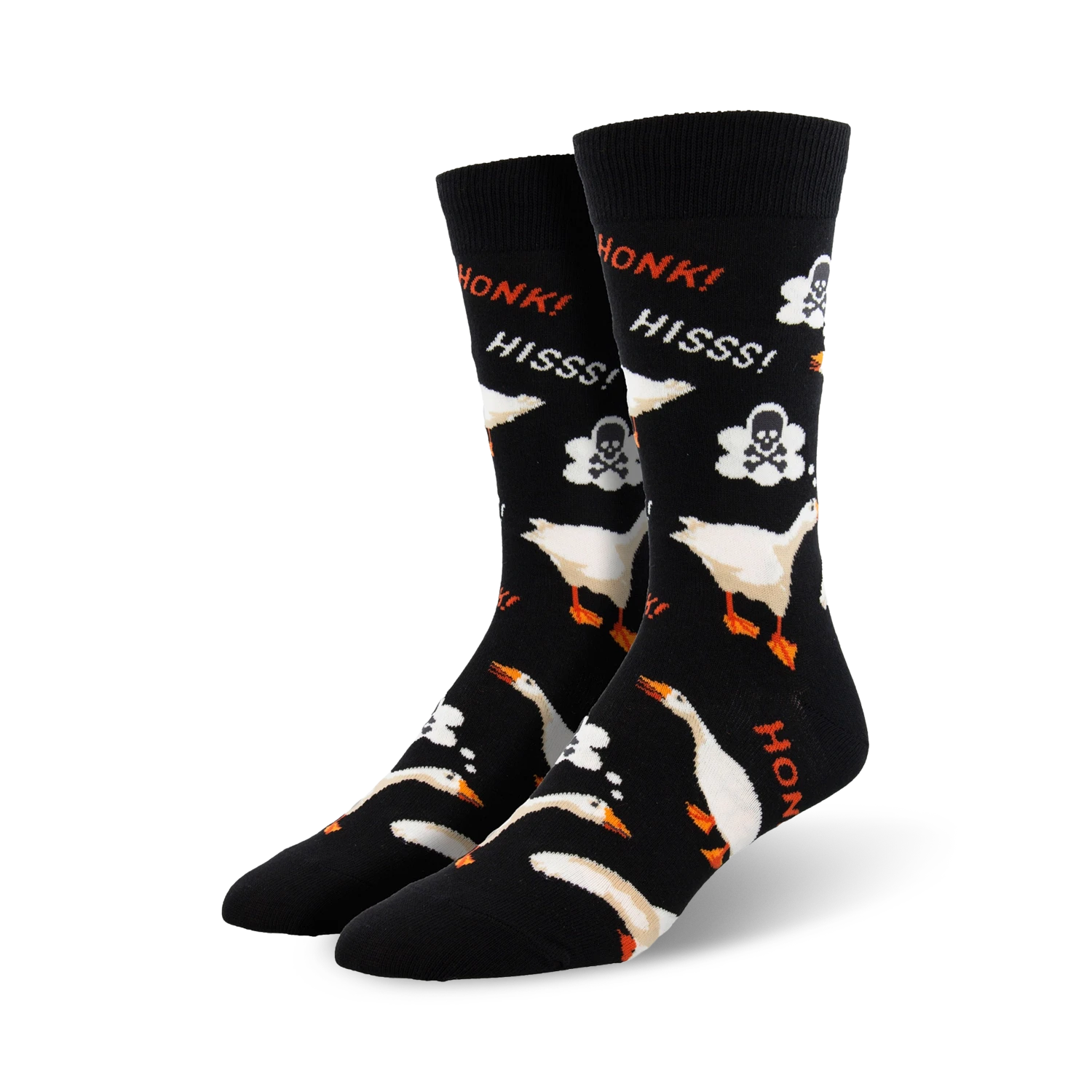 Honk! Honk! These black crew socks for men are covered in white geese with different facial expressions that range from smiling to winking and silly. They’re sure to quack you up!