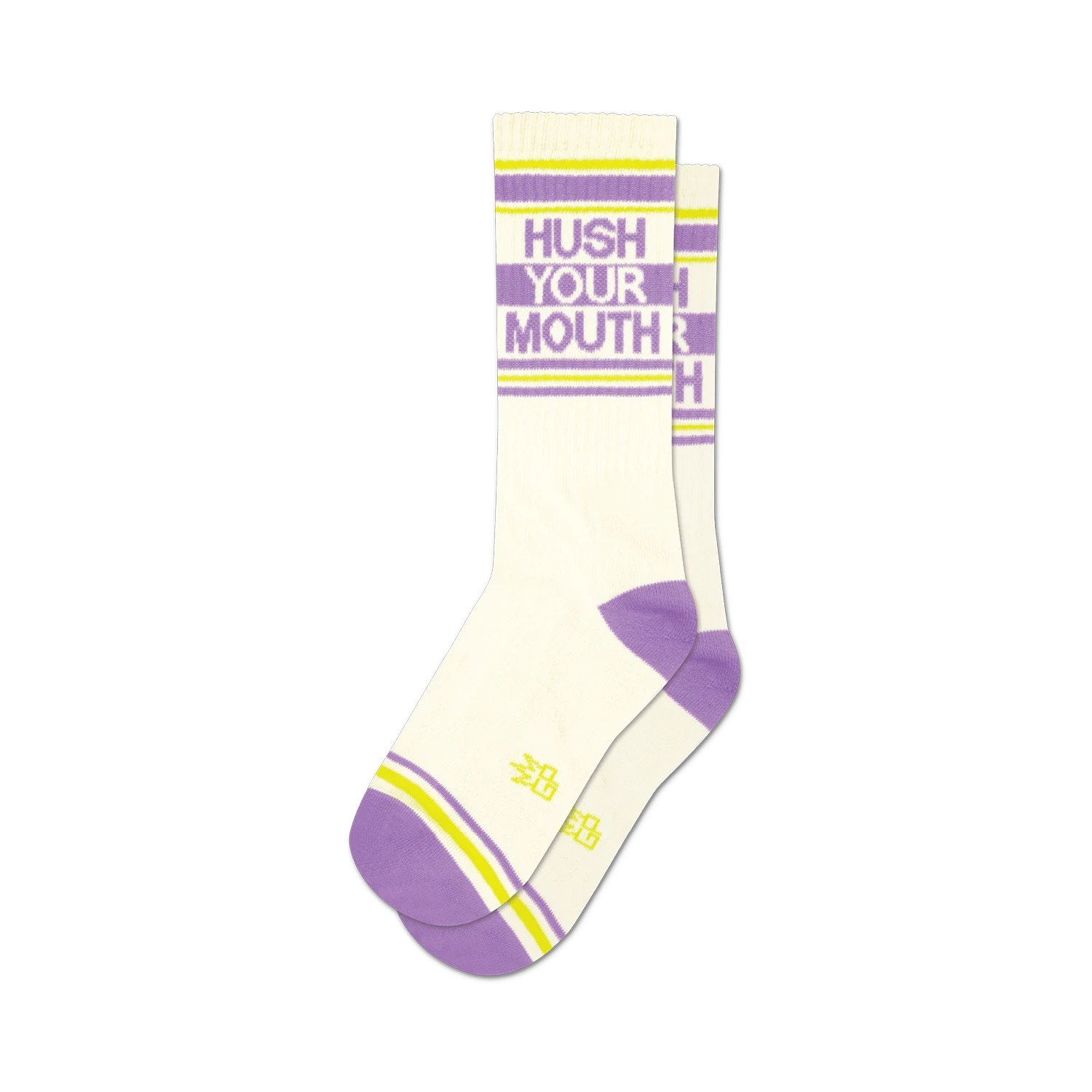 Wrap your feet in whispers with these cream-colored socks, accented with a hint of purple rebellion. Emblazoned with “Hush Your Mouth” in elegant purple script along the leg, they deliver a silent yet striking command. Perfect for those moments when words are superfluous, these socks are your go-to for maintaining decorum in style. Why speak when you can simply strut?