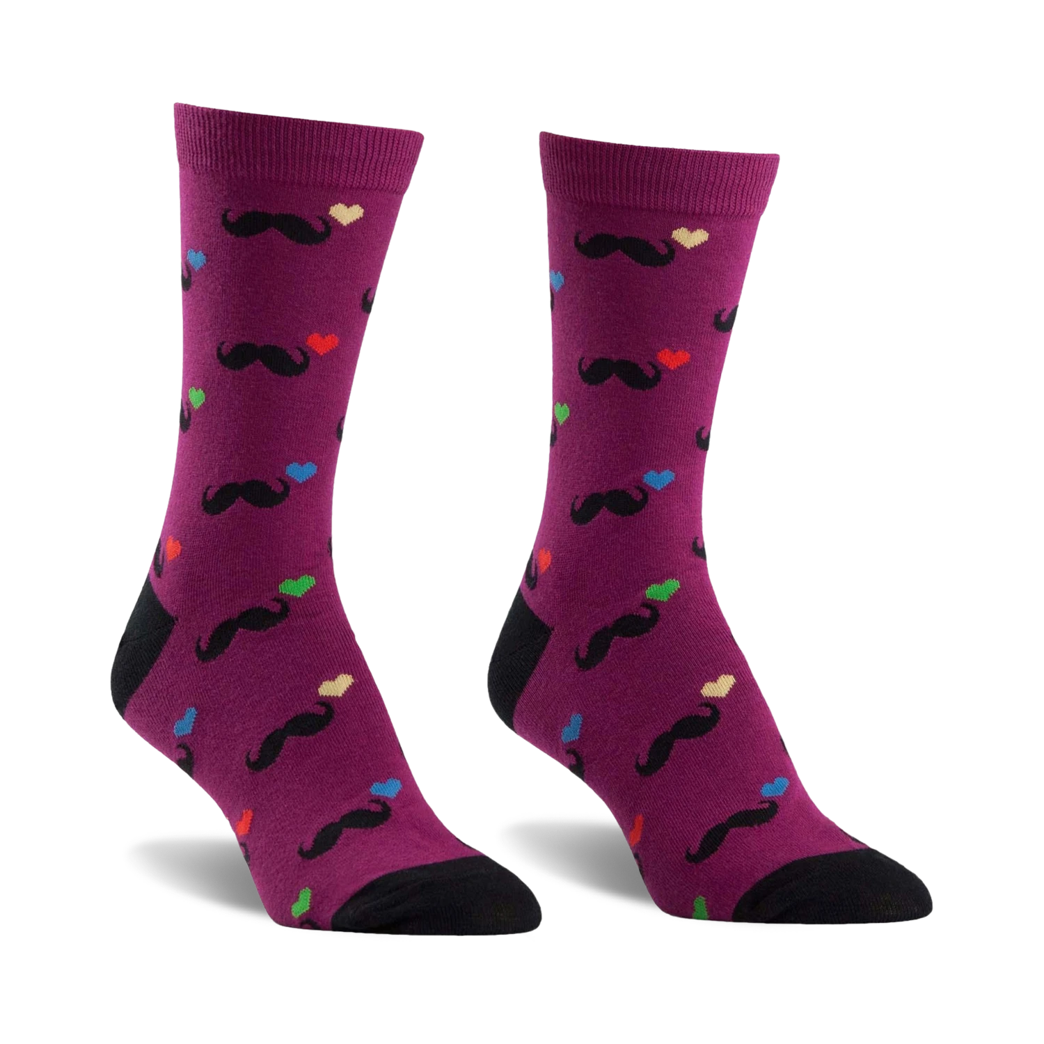 Do you love mustaches? Well, you will love these dapper socks in a posh plum hue! These fancy socks will have you feeling jolly good! Each cool pair of crew socks features tiny black mustaches and different colored hearts to show off your appreciation for that upper-lip masterpiece. Comb not included.