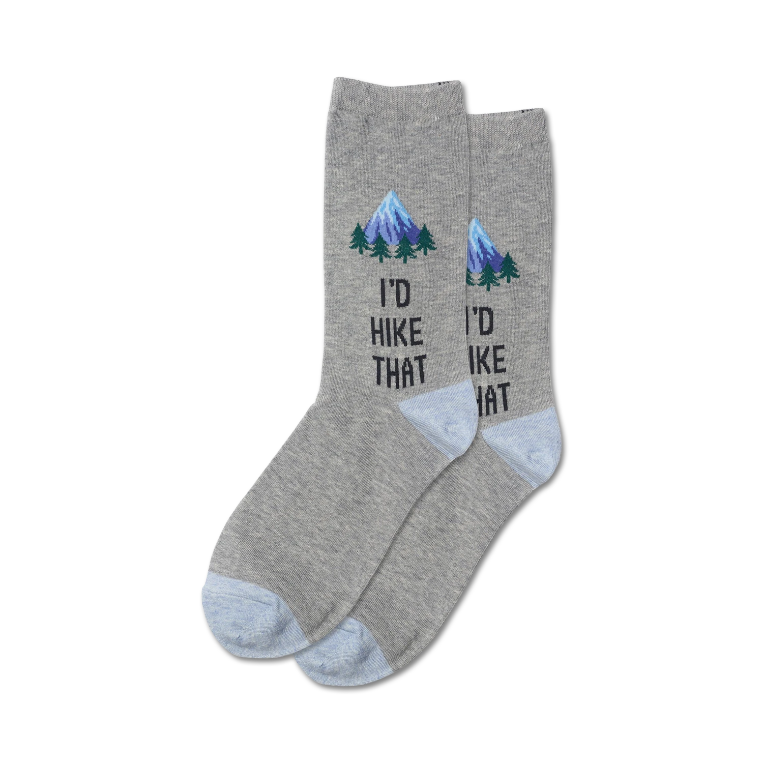 Take a hike with these cozy crew socks! These womens socks feature a blue toe, heel, and cuff with a pattern of blue and green pine trees and black mountains on a gray background. The title: “I’d Hike That,” is a fun play on words that reflects the socks’ hiking theme. Perfect for any outdoor enthusiast, these socks will keep your feet happy, even after a long day on the trail.