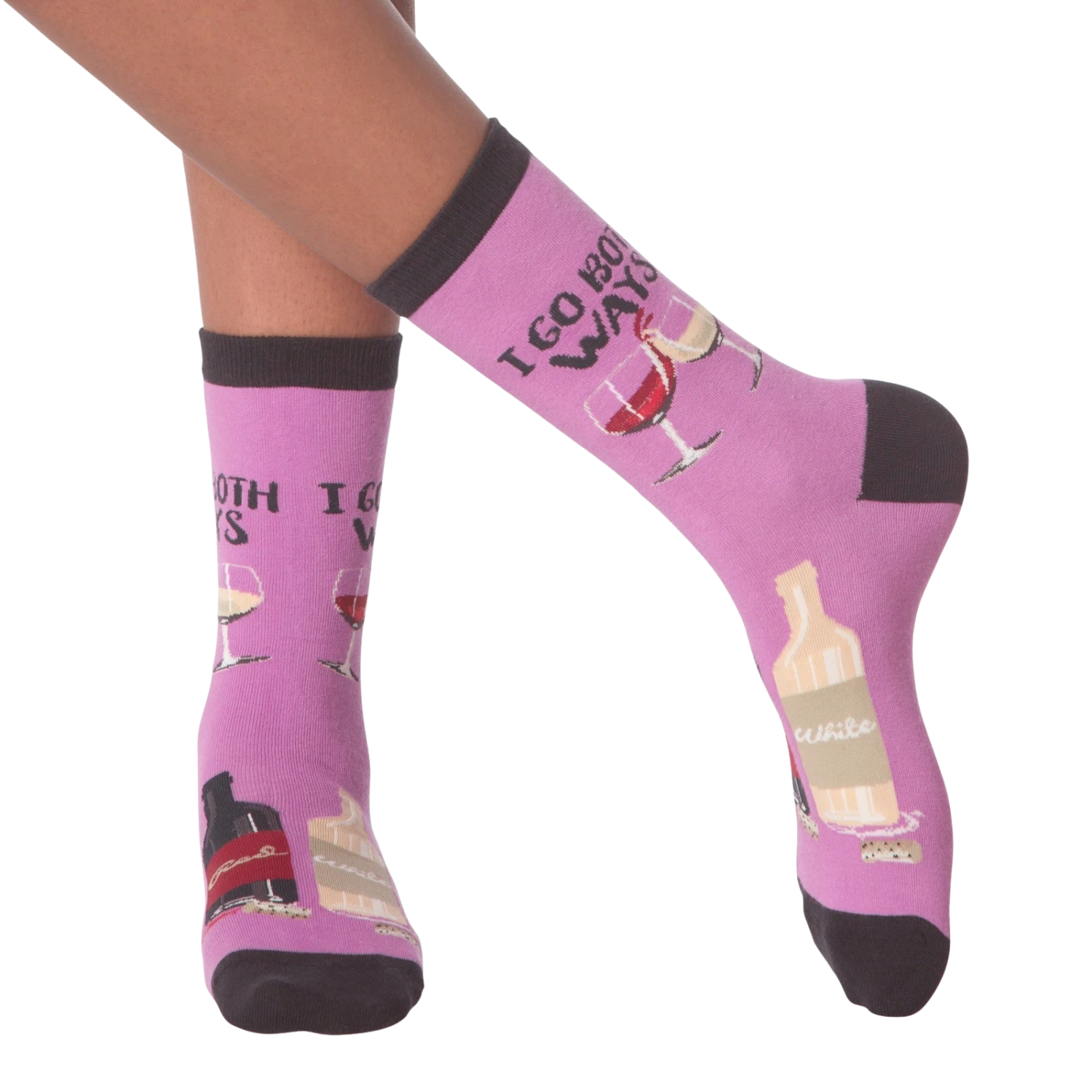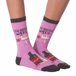 These purple crew socks say ‘I Go Both Ways’ in bold white lettering, with a picture of red and white wine glasses and a bottle of red wine. Like a good wine, these socks can be worn with both a casual and formal outfit, making them the perfect, lighthearted accessory to any wardrobe.