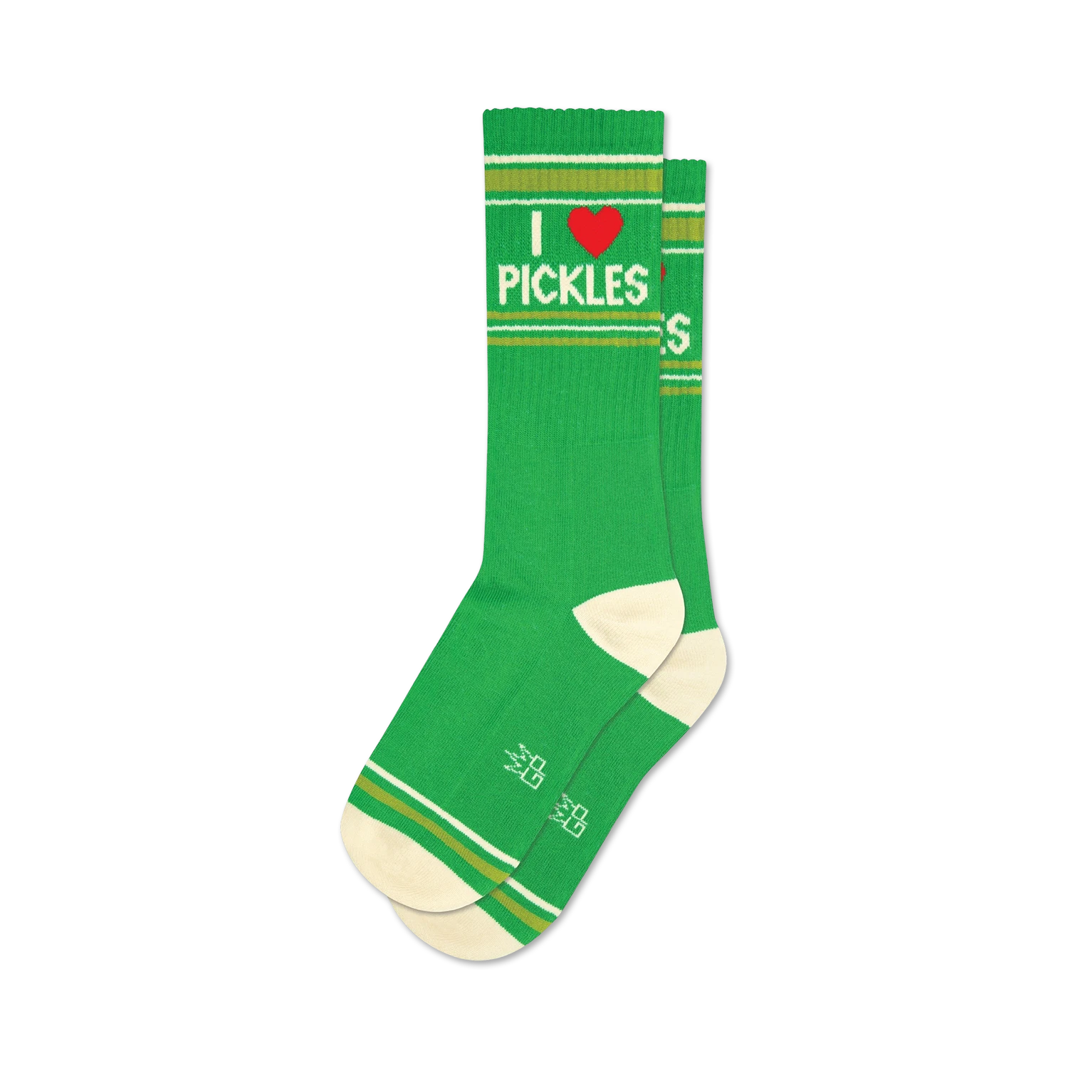 Love those pickles! These I Heart Pickles socks give you a dilly of a good time. Topped with bright green with white accents and featuring a fresh red heart with ‘I Heart Pickles’ written above, you’ll never dill-iver these socks. Show your love for this crunchy snack and pickle lovers will relish the humor. Wear your sole-food with pride!