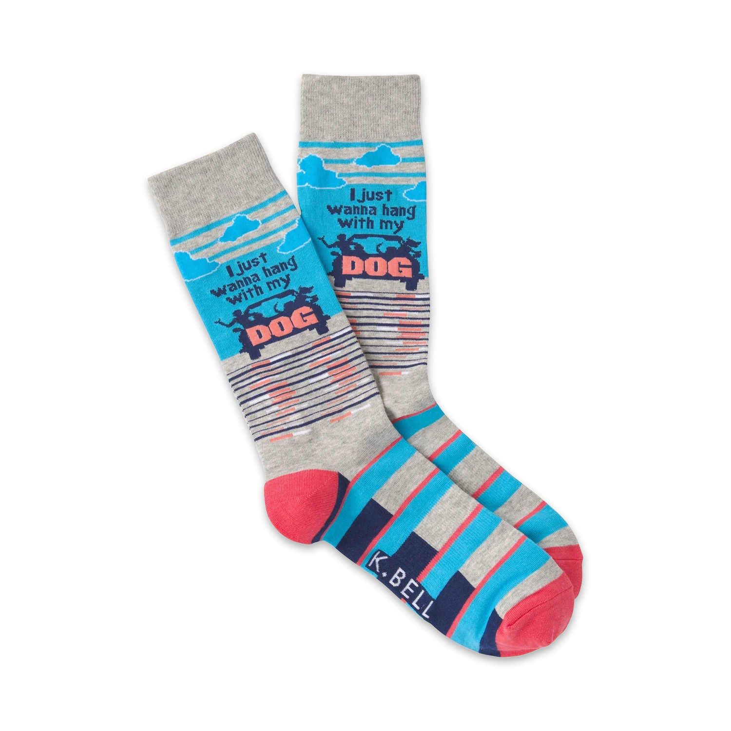 Sometimes hanging out with your favorite dog is very much a literal concept. These funny socks will let people know your priorities! Each cool pair of gray crew socks features a funky design in blue, pink, and purple with a stick man and his stick dog driving in the car together. Ditch the humans and be proud to hang out with man’s true best friend.