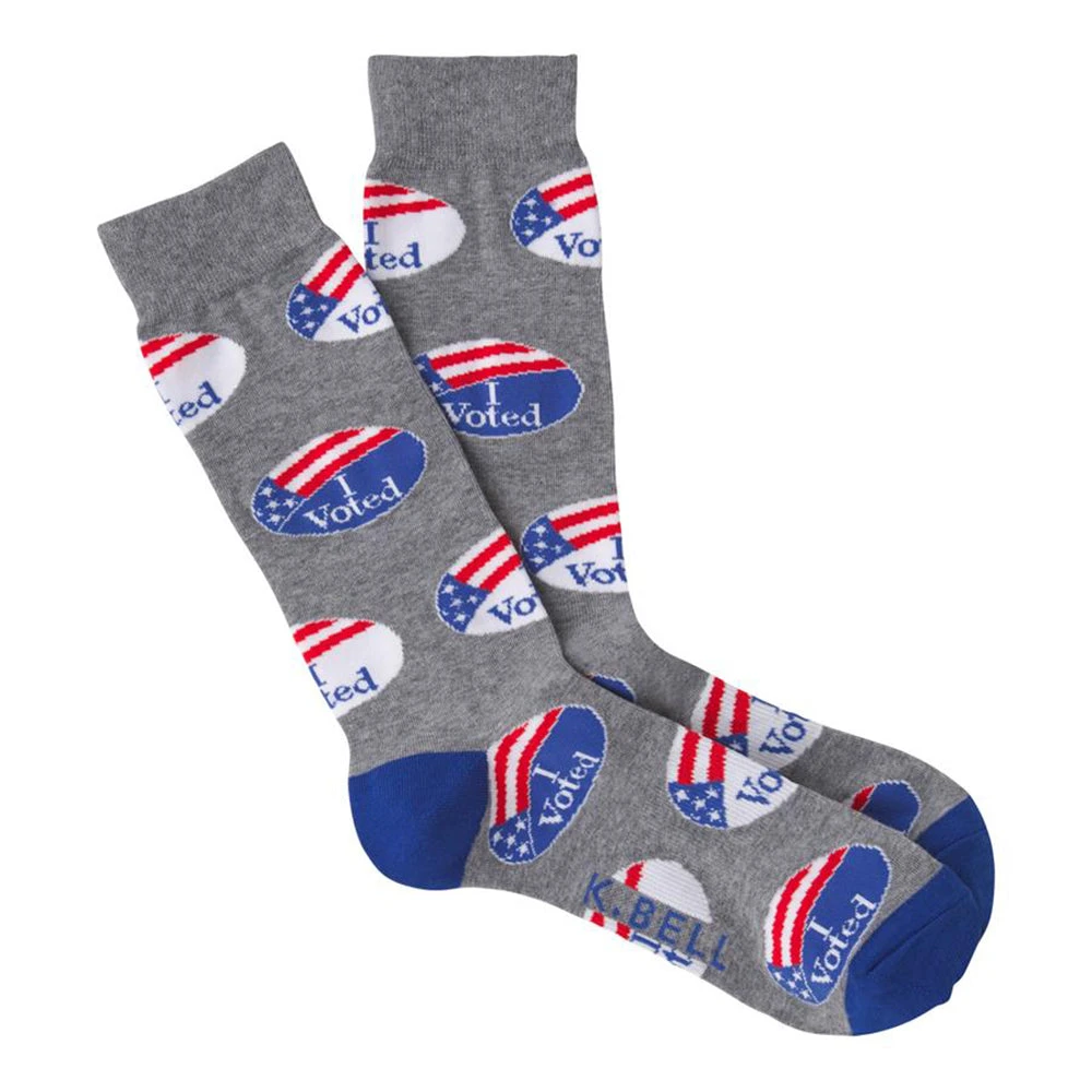 I Voted Sticker Socks by K Bell are the perfect gift for that socks lover in your life. These political themed mens crew socks come in multiple color Options and fit Men’s Shoe Size 6.5-12. Made of 35% Cotton, 32% Polyester, 30% Nylon, 3% Spandex for comfort and durability. A pair of these cool Political novelty Socks will certainly give any wardrobe an instant upgrade. Machine Wash Cold, Inside Out. Only Non-Chlorine Bleach when needed. Tumble dry low. Do not iron.
