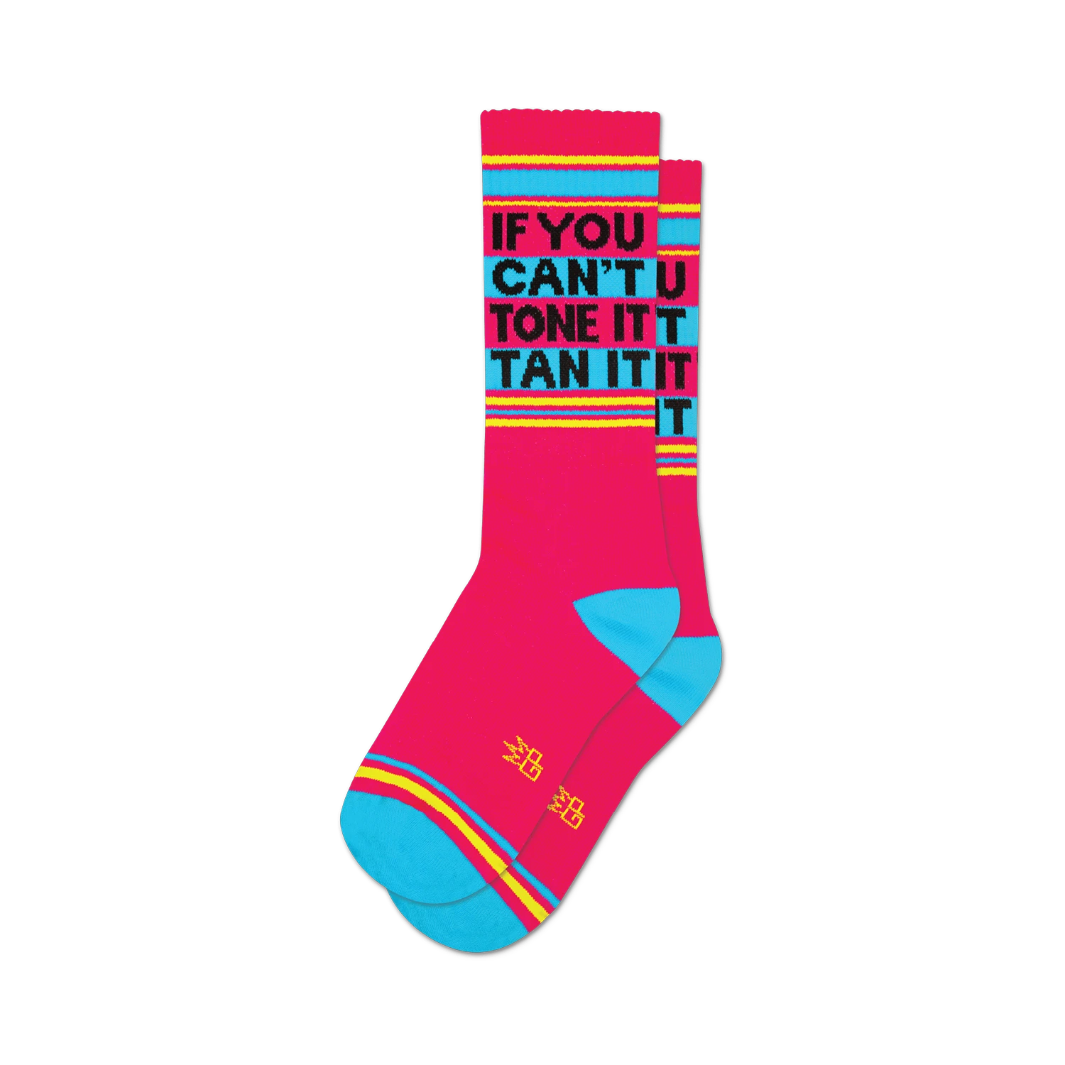 Looking for a cheeky splash of color to brighten your day? Check out our ‘If You Can’t Tone It, Tan It’ socks! Splashed in vibrant pink and stamped with a bold, playful message in yellow, blue, and black, these socks are sure to kick-start conversations and smiles. Perfect for lounging around, adding a pop to your gym outfit, or making a statement at casual get-togethers. Who says you can’t turn heads with your fabulous sock choices? Go ahead, slide into these and flaunt that brilliant attitude everywhere you go!