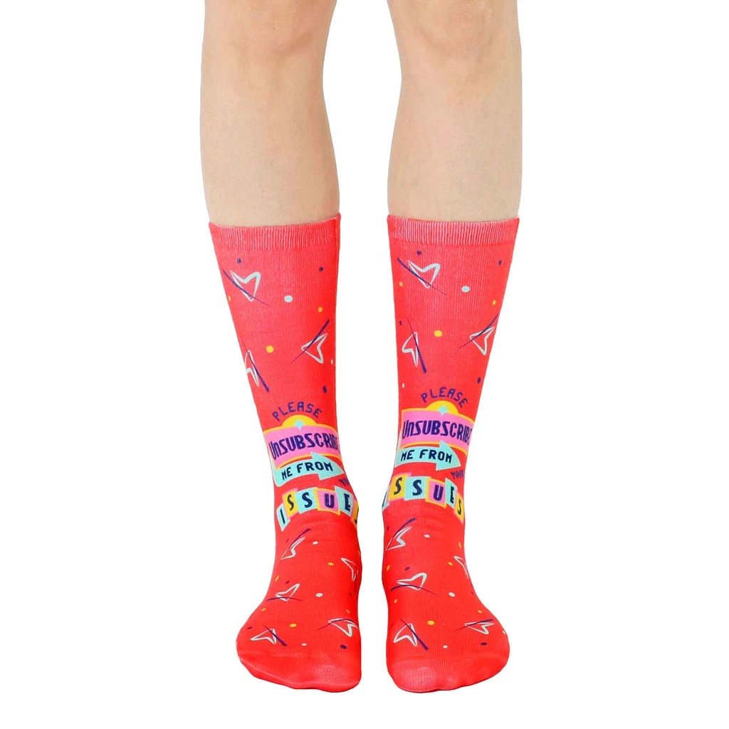 Show the world your lit sock style with these “Please Unsubscribe Me From Your Issues” crew socks in bright red. Emblazoned with light blue and yellow stars and hearts, these meme worthy socks are sure to spark convos wherever you strut your stuff!