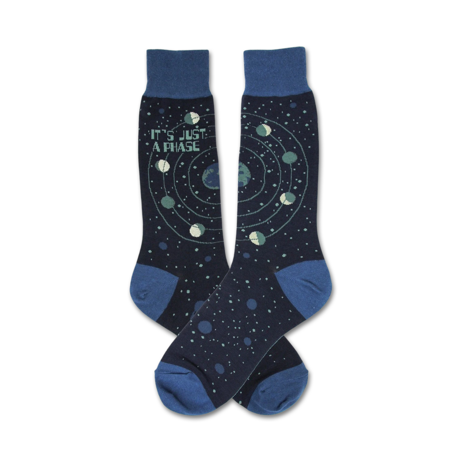 Blast off into the cosmos with this pair of out-of-this-world socks! Featuring the solar system in all its celestial glory, complete with Pluto (yes, we still love it), and a smattering of moons. Don these stellar socks, grab your favorite space jam, and let your feet voyage among the stars. Who said astronomy couldn’t be fun? Plus, with the words ‘It’s Just A Phase’ emblazoned across the toes, you’ll make everyone moon over your lunar-cy! Your feet will thank you, the Earth will thank you, and even Pluto will be sending you love from the Kuiper Belt.