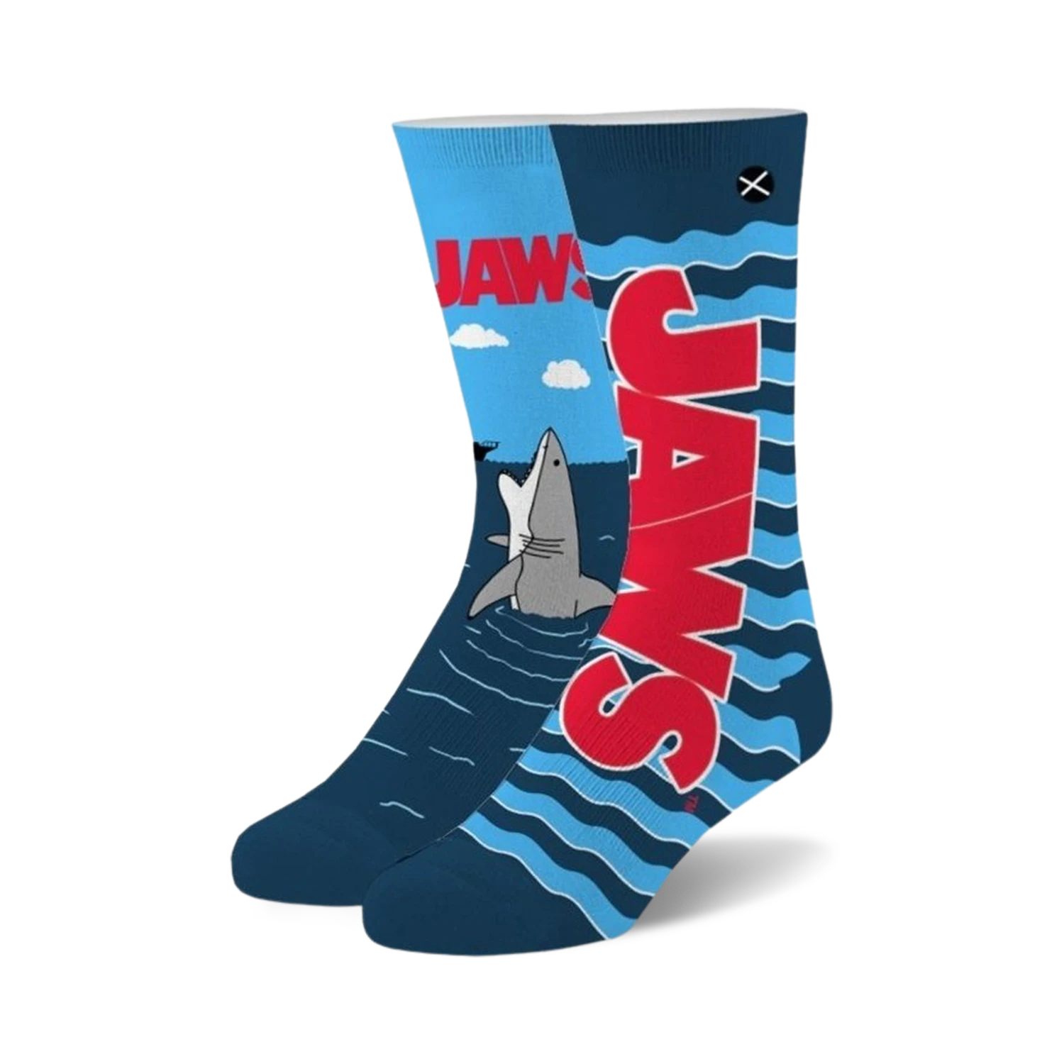 Jump into the fun with our Jaws Open Wide socks! These blue crew socks feature a gray shark with a red fin leaping out of the water with its mouth gaping wide and clouds floating in the background. Perfect for men and women, these socks will make a splash wherever you go. Did you know that sharks have existed for over 400 million years? That’s longer than dinosaurs!