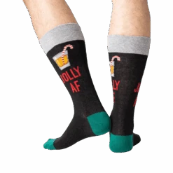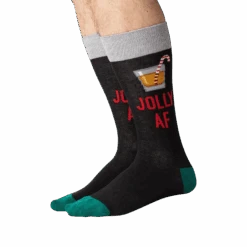 Candy cane and liquor glass printed men’s crew socks with the words “Jolly AF” are perfect for your next Christmas party or ugly sweater party. Show your holiday cheer with these socks that make an excellent stocking stuffer, Secret Santa gift, or Christmas present.