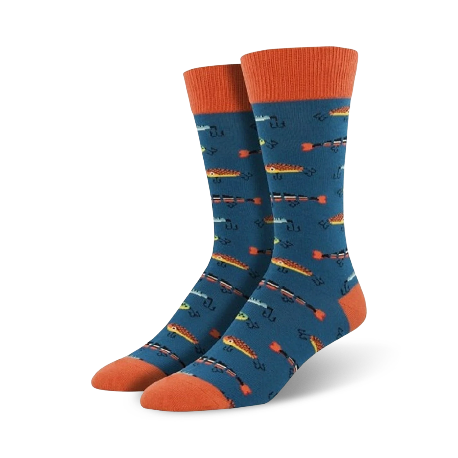 Lazy afternoons get no better than a cold drink and a day of fishing out on the open waters. These fun socks are the perfect fit for anyone with a stacked tackle box. Each cool pair of blue and orange crew socks features a print of several different fishing lures complete with hooks.
