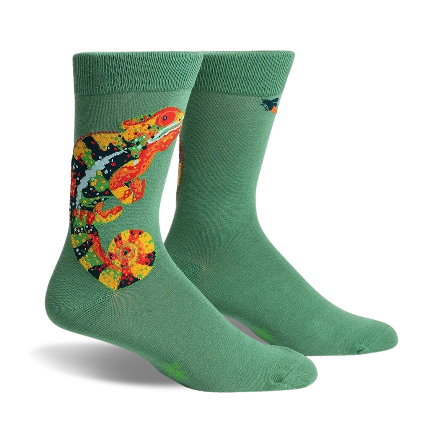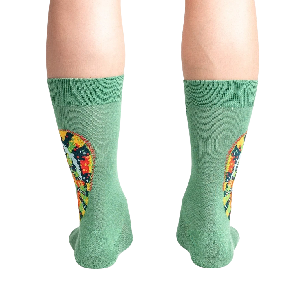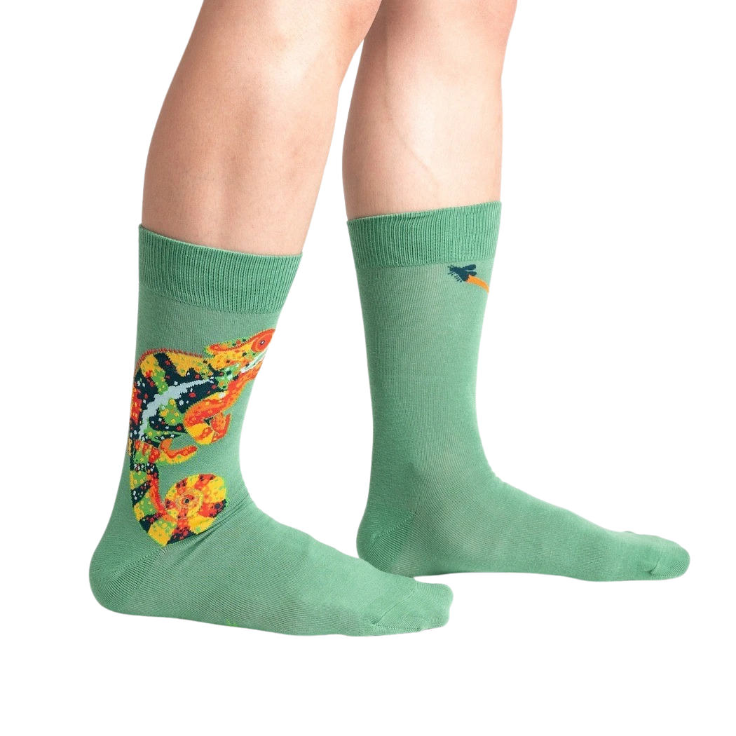 Calling all chameleon enthusiasts! These Karma Chameleon socks are as vibrant and unique as the creature they’re named after. With a dark green base and a pattern of multicolored chameleons, they’re impossible to miss. Plus, they’re crew length, providing extra comfort and coverage for your feet. So, whether you’re a fan of the 80s pop hit or just love these amazing creatures, these socks are perfect for you. Get ready to rock them and blend in with style!