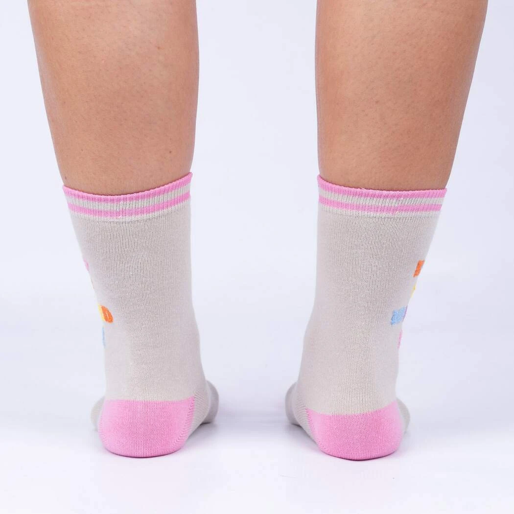 Crew length, these ‘Keep It Weird!’ socks in white will brighten up any day. Just look at those rainbow-colored letters on the left sock and the pink heel and toe adorned with a little sun graphic on the right. Whether you’re rocking them with sneakers, boots, or sandals, they’ll add a pop of color and personality to your look. Socks with attitude that live by the mantra, ‘Keep It Weird!’, they’ll inspire anyone to embrace their unique quirks and shine bright. And remember, weird is wonderful!