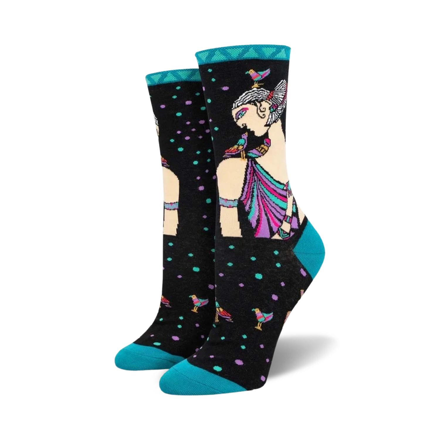 Jump into a flight of whimsy with our Laurel Burch Alka Socks! These eye-catching socks feature a vibrant pattern of a woman surrounded by a symphony of colorful birds. From the magnificent turquoise trim, bold blue toe and heel, to the purple dress of the woman and the brilliant blues, greens, yellows, and oranges adorning the birds, these socks are a kaleidoscope of artistic flair. Each pair is a celebration of color, creativity, and the magic of Laurel Burch’s world. Get ready to turn heads and set imaginations soaring in these sock masterpieces!