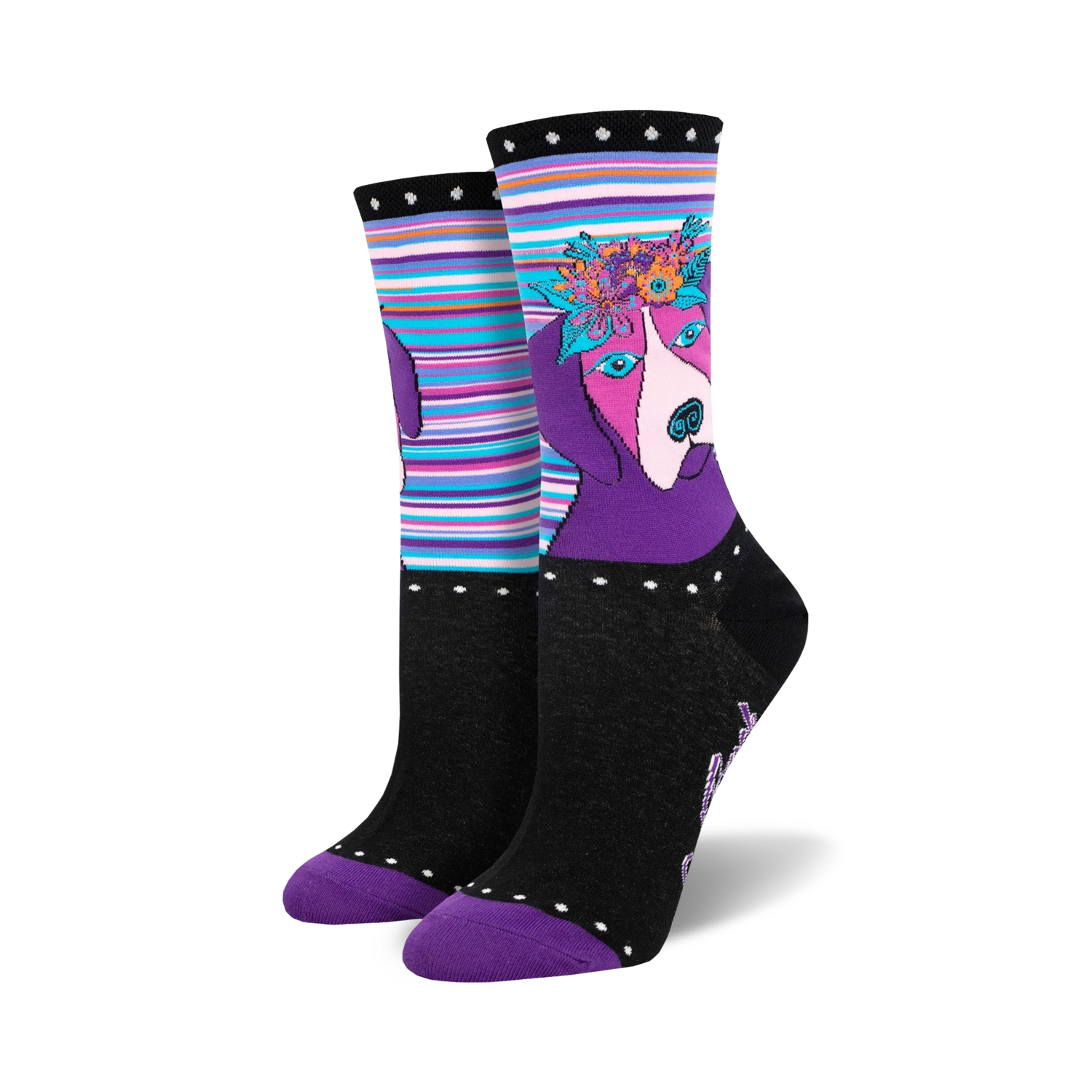 Calling all dog-loving fashionistas! Prepare to paws-itively rock these Laurel Burch Violet Crew Socks. Picture this: a captivating black canvas adorned with a colorful tapestry of flowers, leaves, and the most adorable doggo visage you’ve ever seen. This purple-faced pooch with a pink nose is living its best life, sporting a whimsical wreath of flowers. With a purple toe and heel sprinkled with white polka dots and a striped cuff, these socks are anything but ruff. Get ready to unleash your inner canine couture and strut your stuff in these paw-some socks!